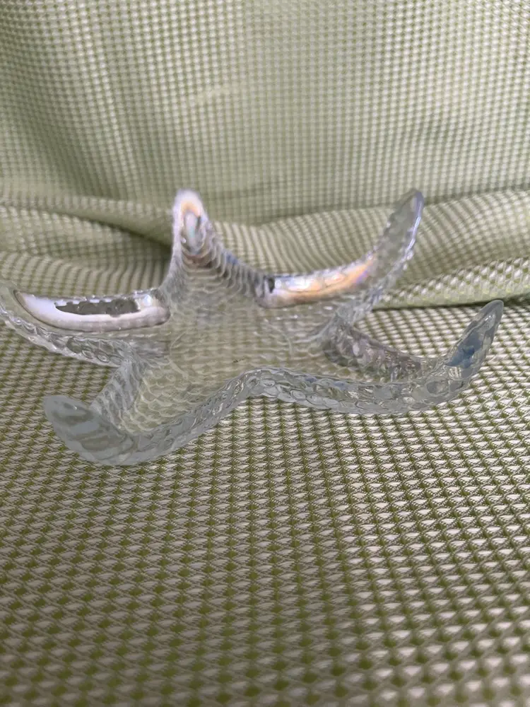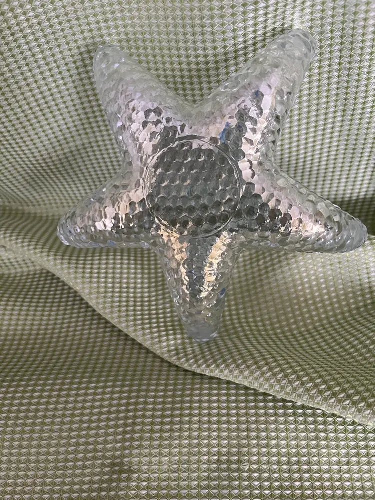 Add a beachy and fun vibe to your home decor with this beautiful iridescent art glass starfish plate. The plate features a whimsical starfish design that is sure to catch the eye of anyone who sees it. Made of high-quality pressed glass material, this unique art glass piece is perfect if you live at the seashore or in the mountains. Measuring 7 inches in diameter, this unit is a unique addition to any collection. The clear glass is iridescent, which gives it a unique and eye-catching look. This art glass plate is perfect for use as a decorative piece or as a serving dish for your favorite snacks.