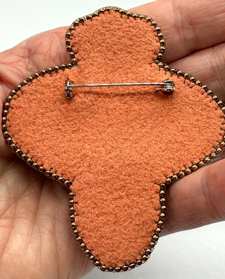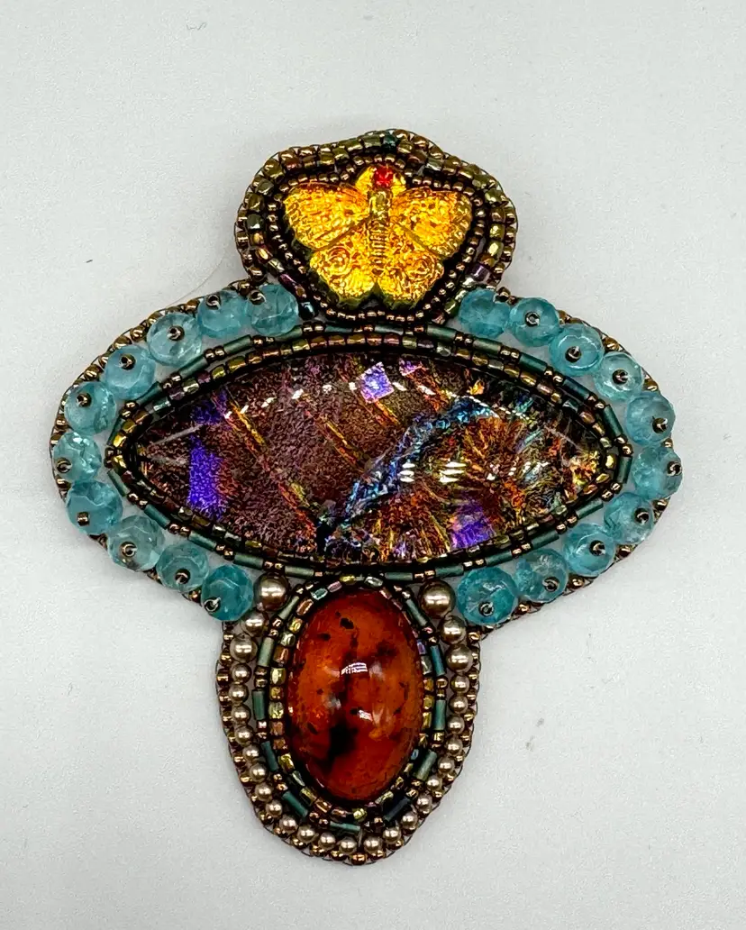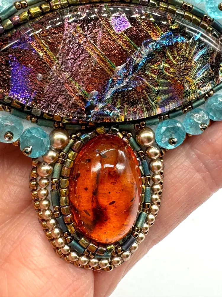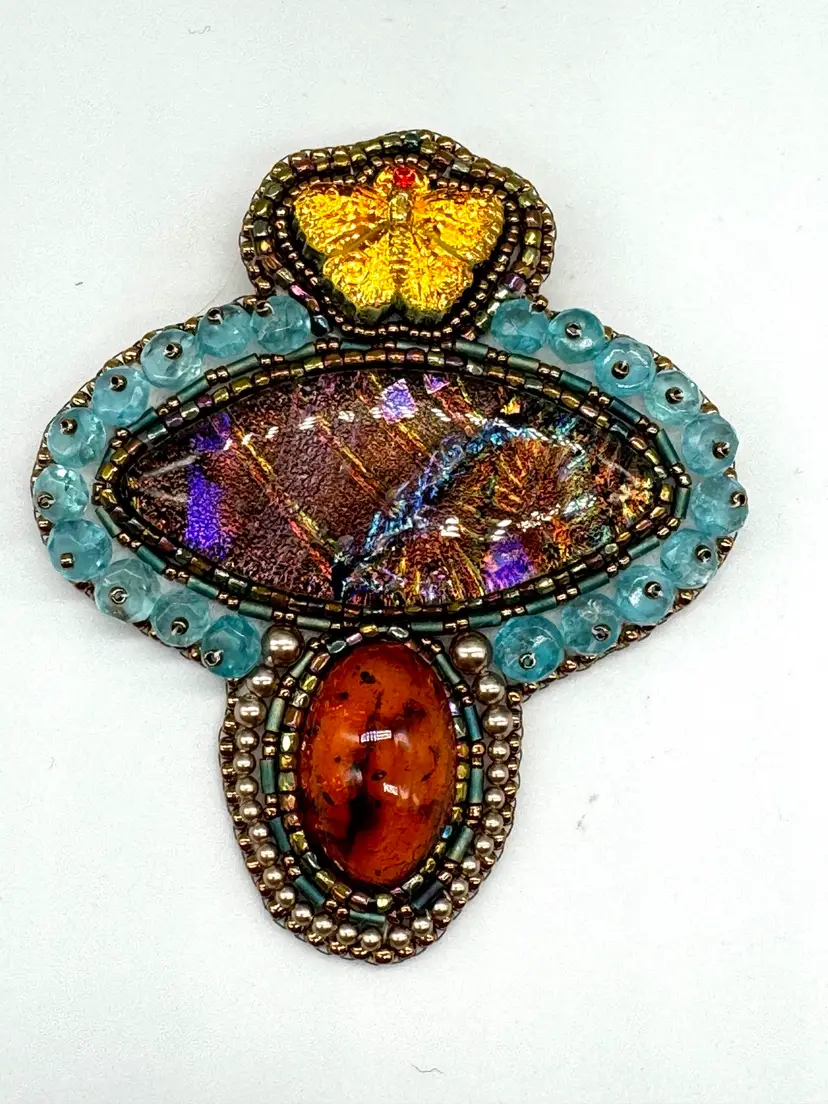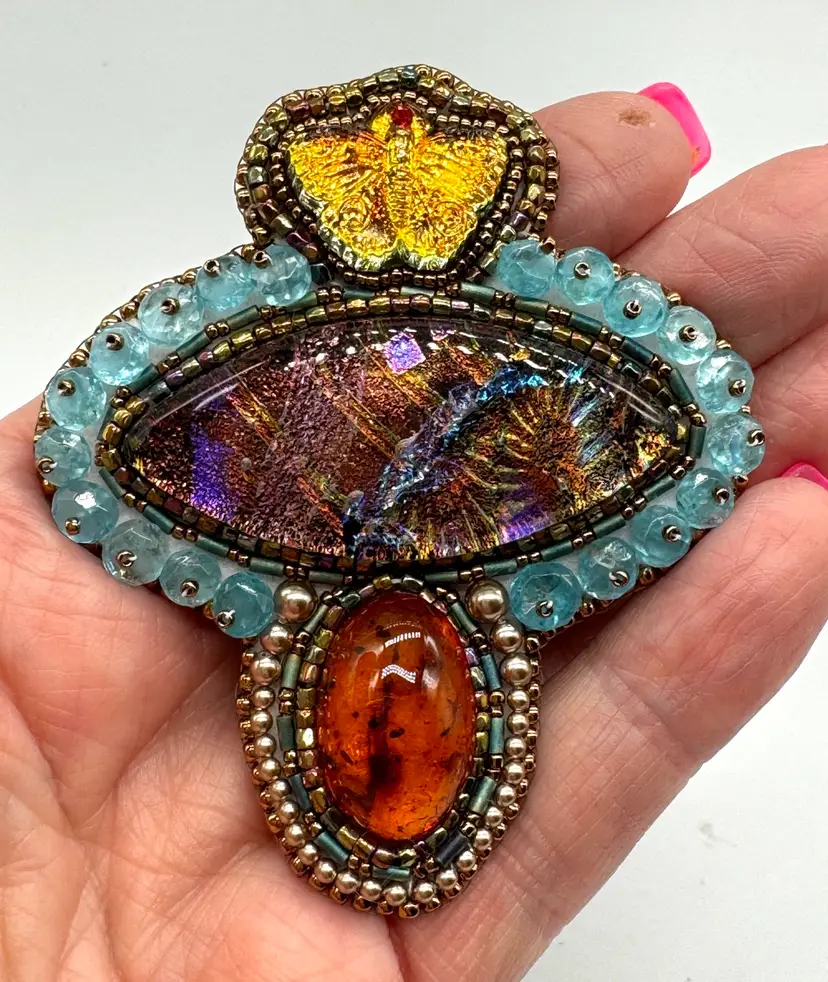 Beautiful brooch bead embroidered by me in my Seattle studio. The navette glass cab is made by my friend who lives in Australia. The blue beads around it are natural apatite beads. The butterfly is a vintage Czech button and finally the bottom stone is a natural Baltic amber cab. Amazing textures and components, this one will get you noticed! Measures 3” long and 2.5” wide