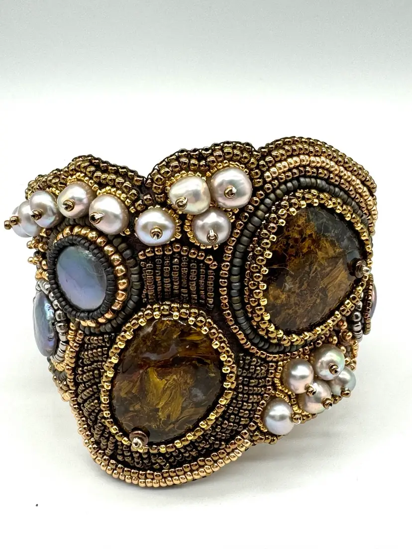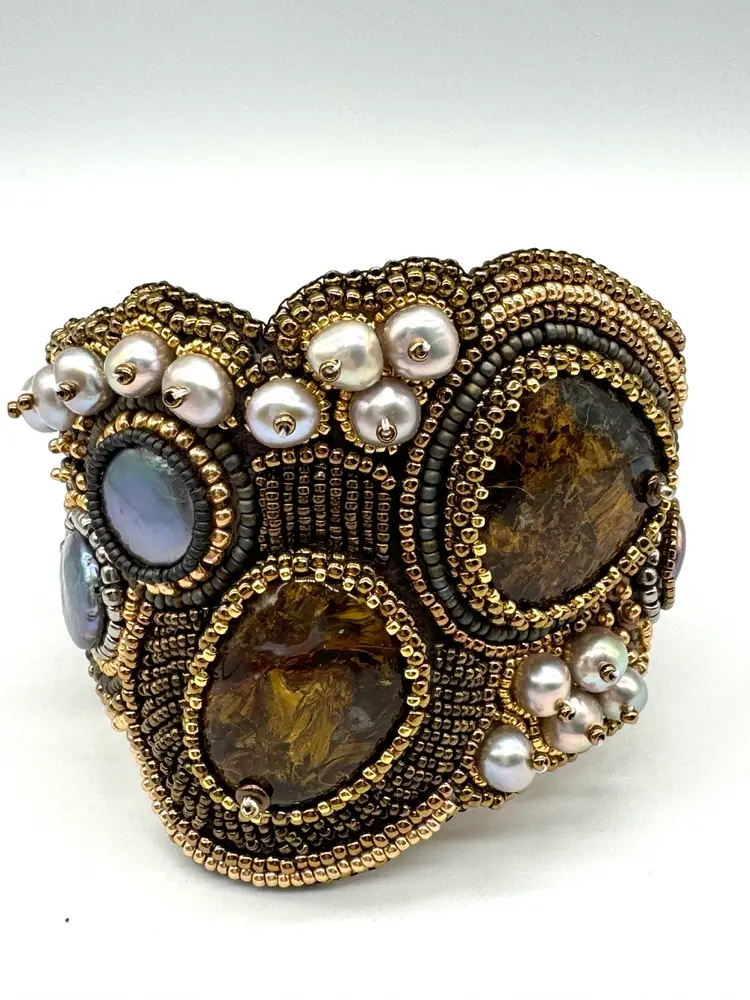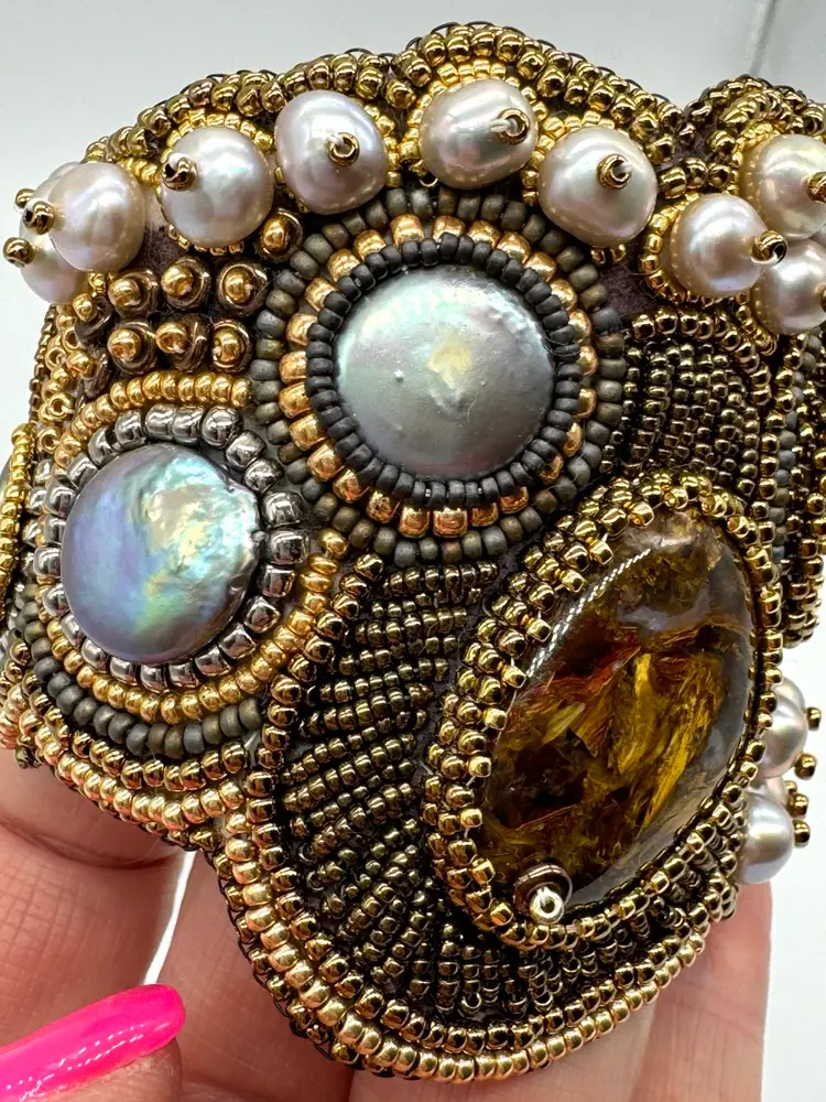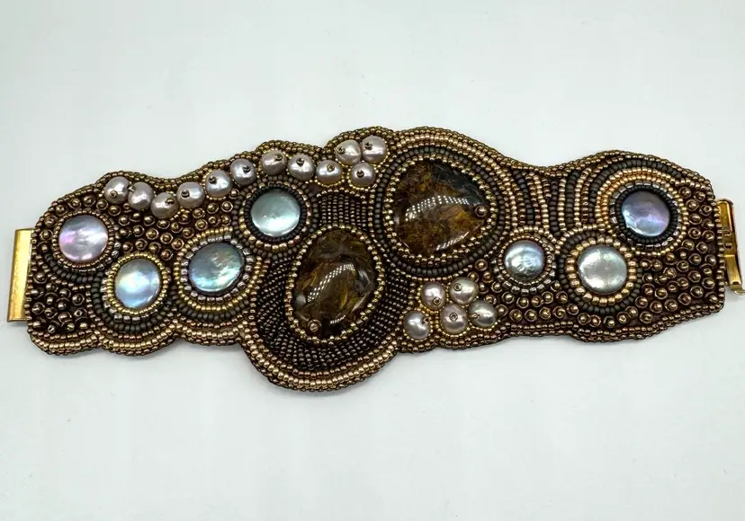 Beautiful bead embroidered bracelet made by me in my Seattle studio. I have combined gray coin pearls cream button pearls and two gorgeous Pietersite cabs. Bracelet has a slide in clasp gold tone, measures 7.5” long and 2.75” at its widest point