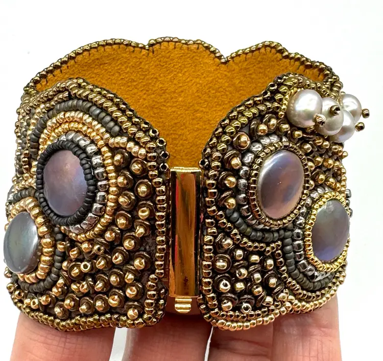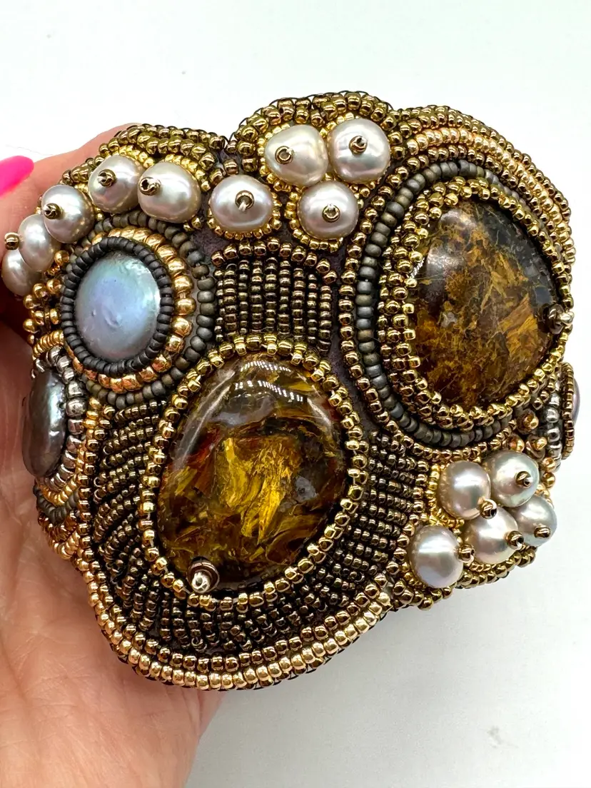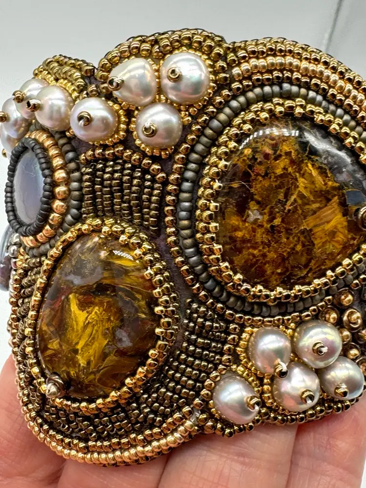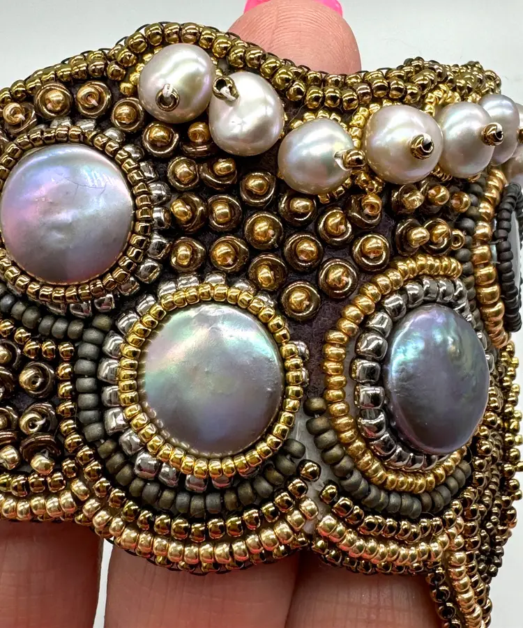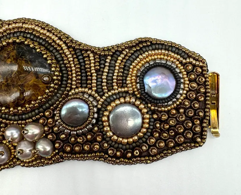 Beautiful bead embroidered bracelet made by me in my Seattle studio. I have combined gray coin pearls cream button pearls and two gorgeous Pietersite cabs. Bracelet has a slide in clasp gold tone, measures 7.5” long and 2.75” at its widest point
