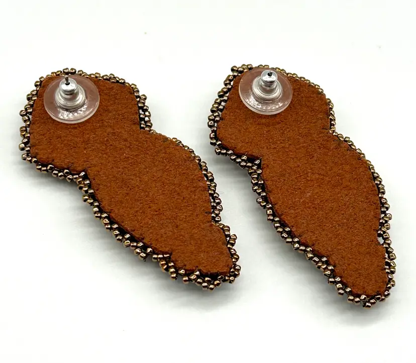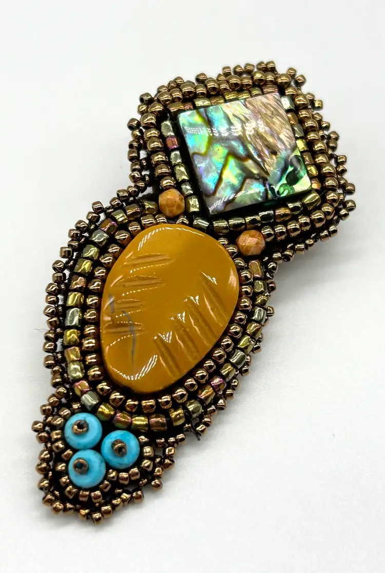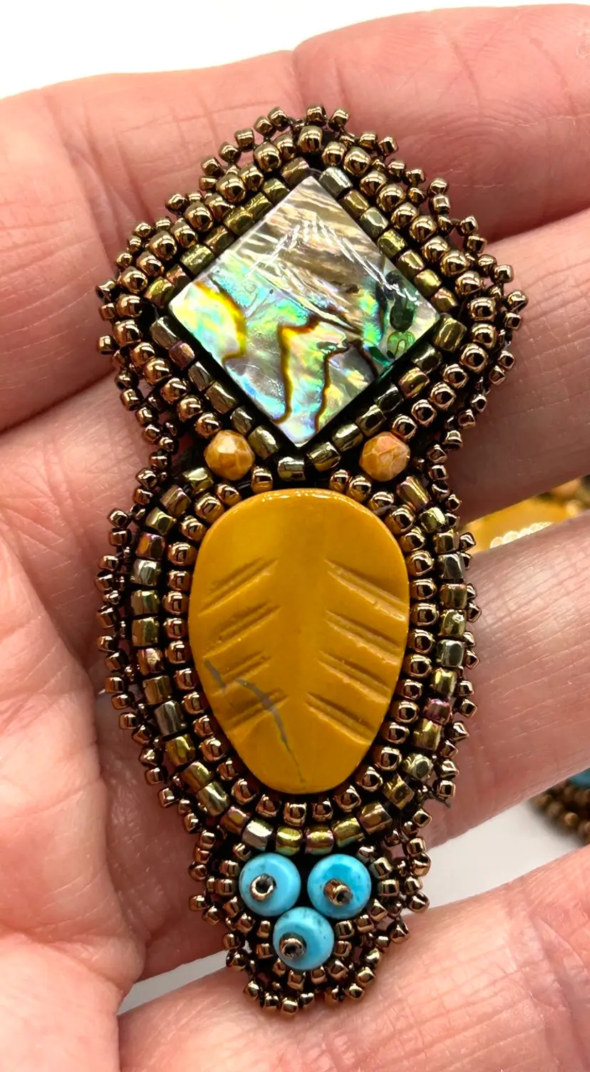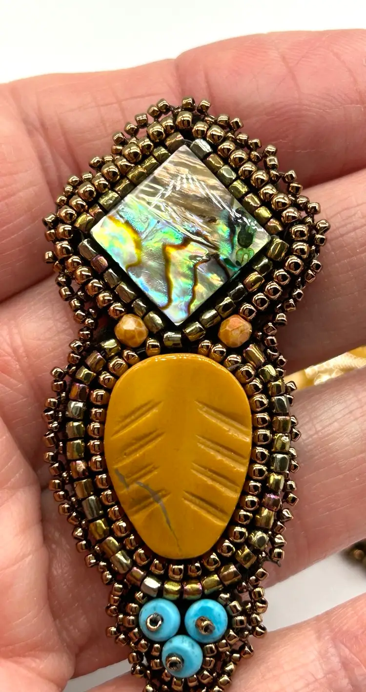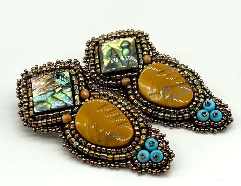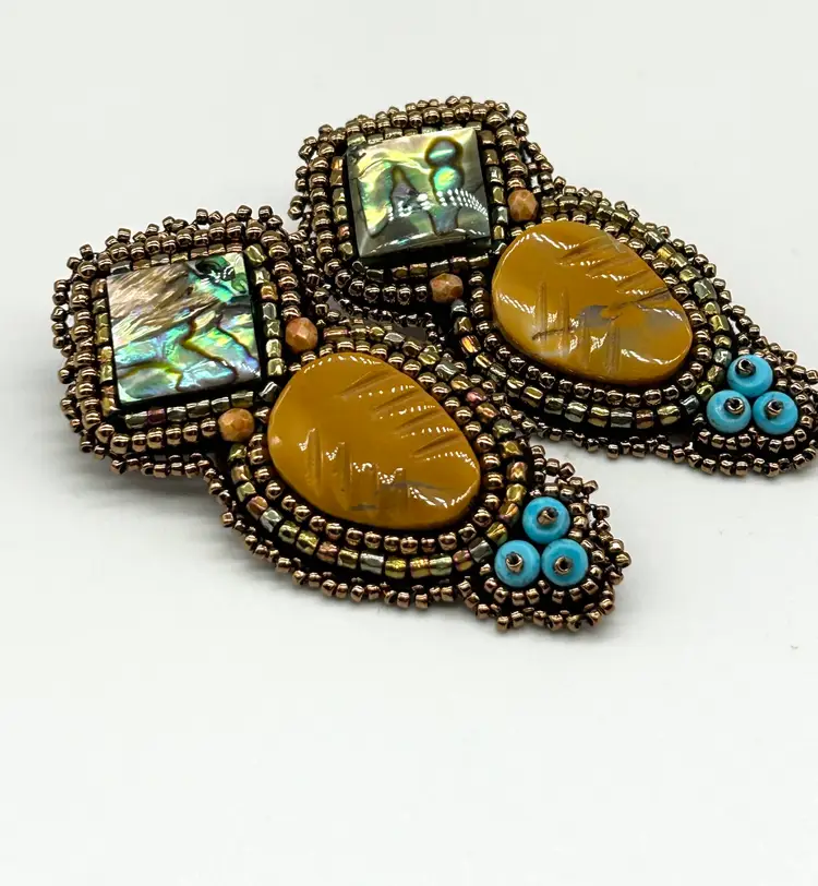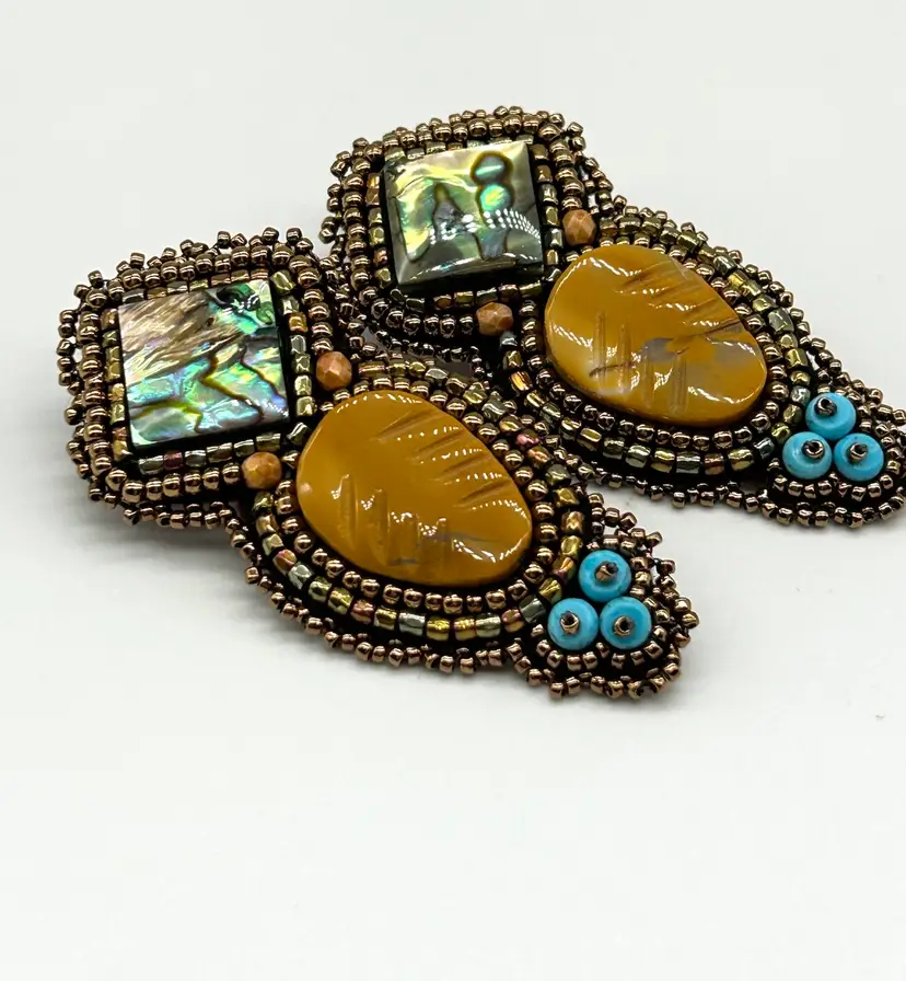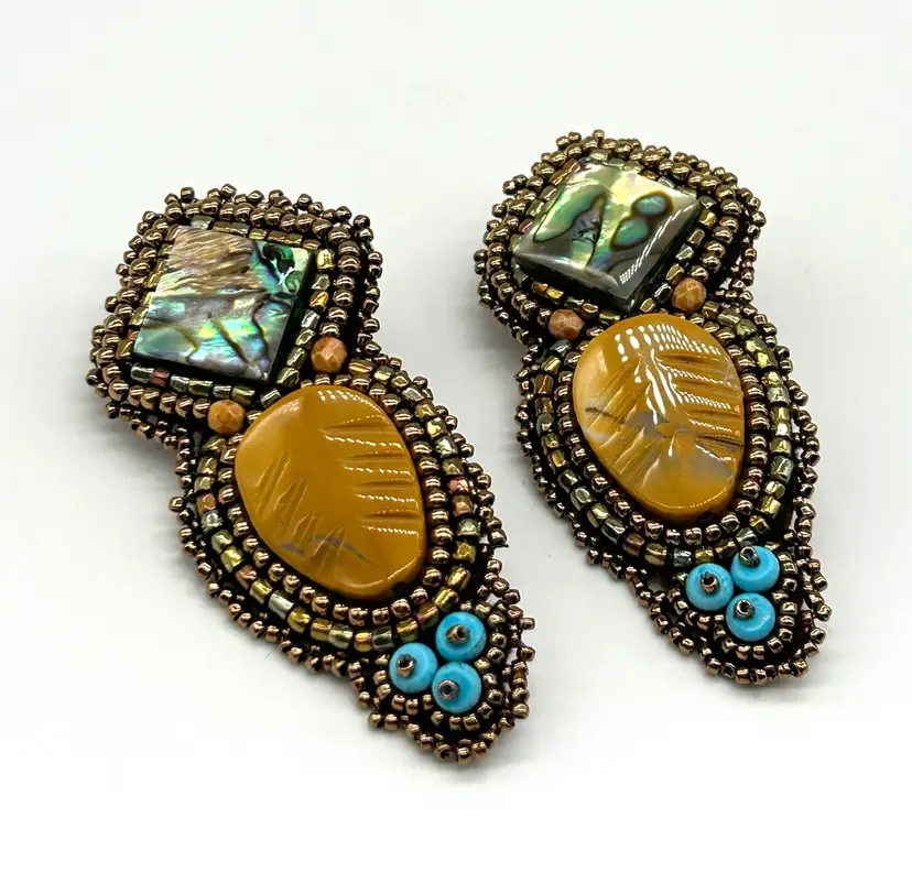 Hand bead embroidered by me in my Seattle Studio I have combined abalone sheds with Mookite leaf beads with turquoise and Miyuki seed beads Light weight these earrings offer surgical steel posts Earrings measure 2.5” long