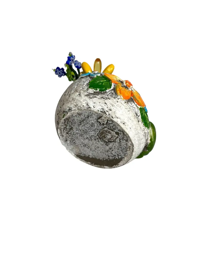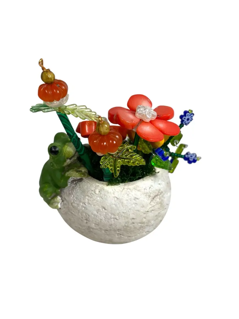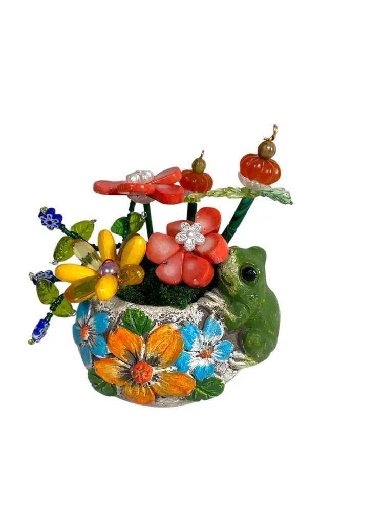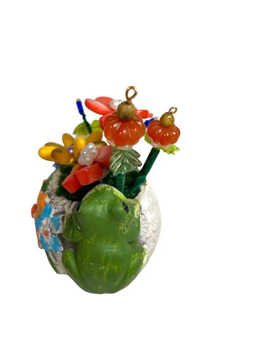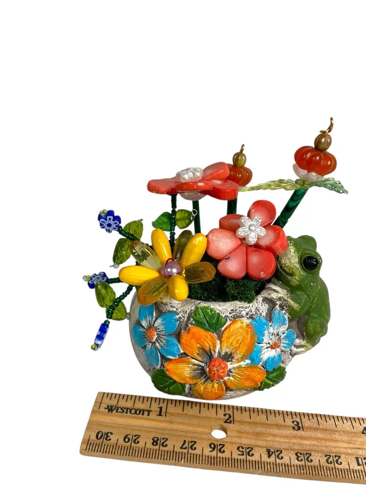 Height 4.5”, length 3.25”, width 2.5”. Flowers were made from me with glass & plastic beads& broken jewelry bits. Mini frog planter bought from estate sale.