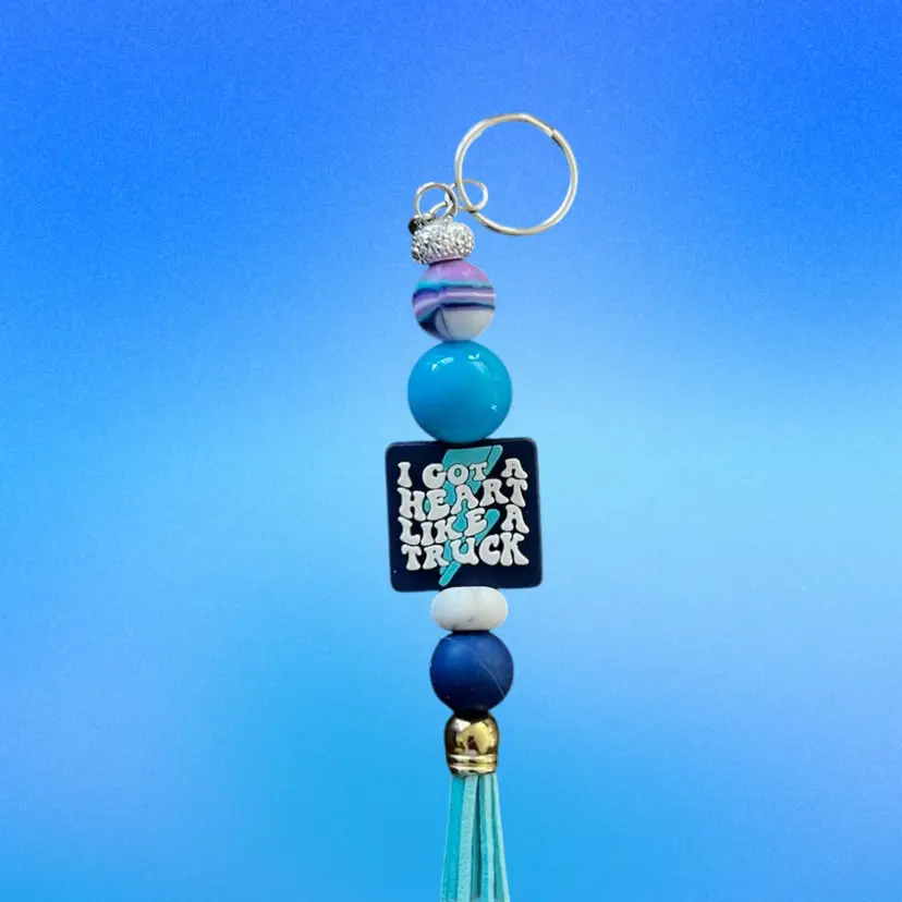 Adorable keychain that says I gotta heart like a truck in blues, white and black.