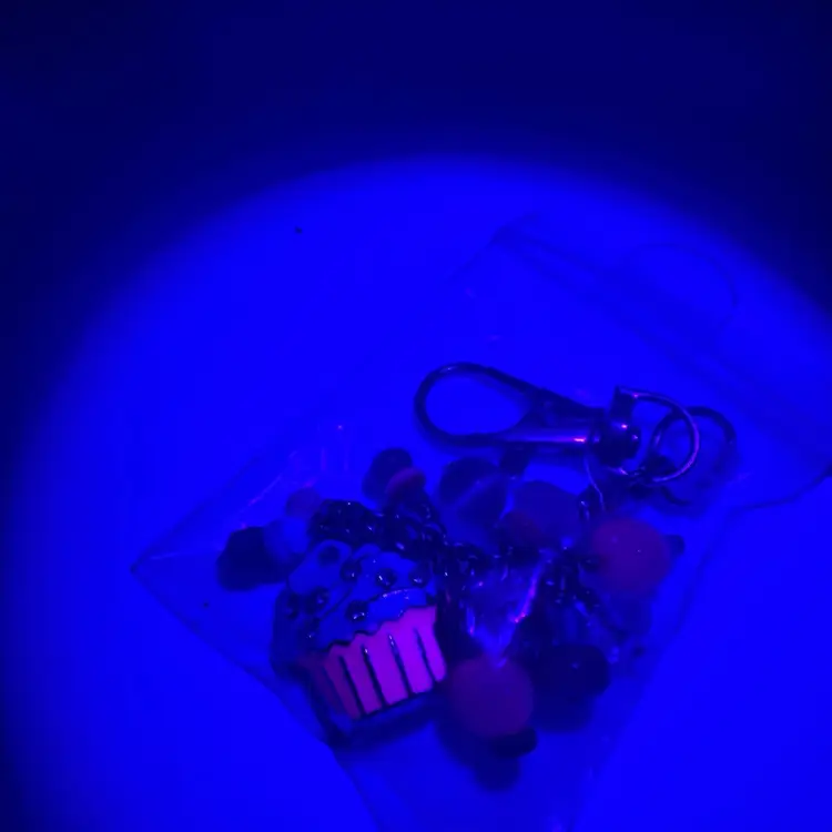 Features a silver tone, enameled cupcake charm with rhinestones and other various shades of blue, pink, and green beads made of glass, stone, and acrylic Silver tone findings Cupcake charm glows, UV Cell phone charm holder which fits between the phone and the case included Also includes a swivel hook for optional use as a purse charm Lobster clasp allows for quick and easy removal when needed without removing case Made by me with repurposed jewelry pieces