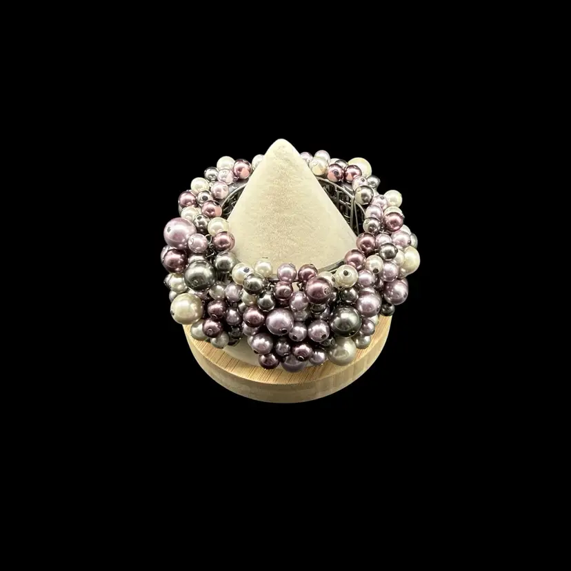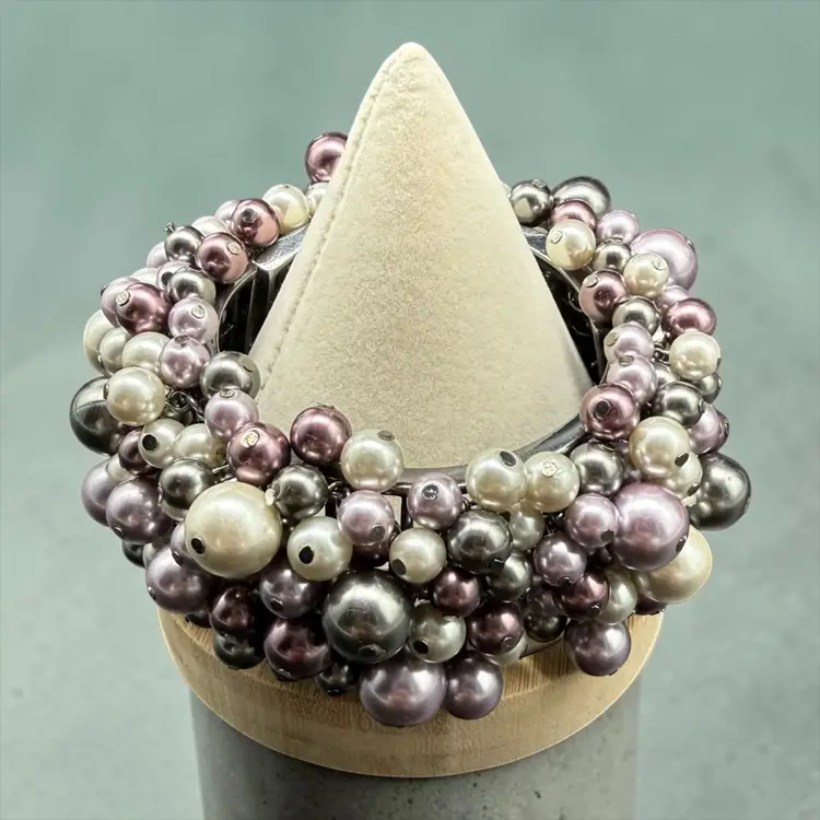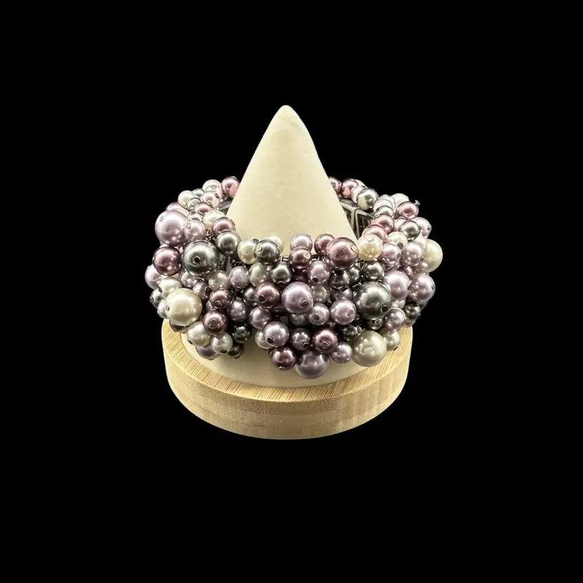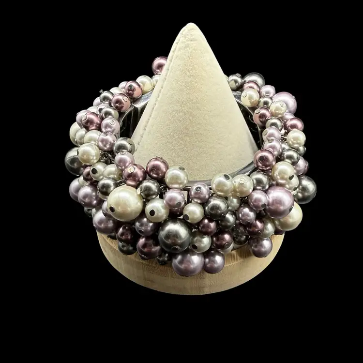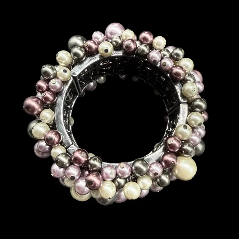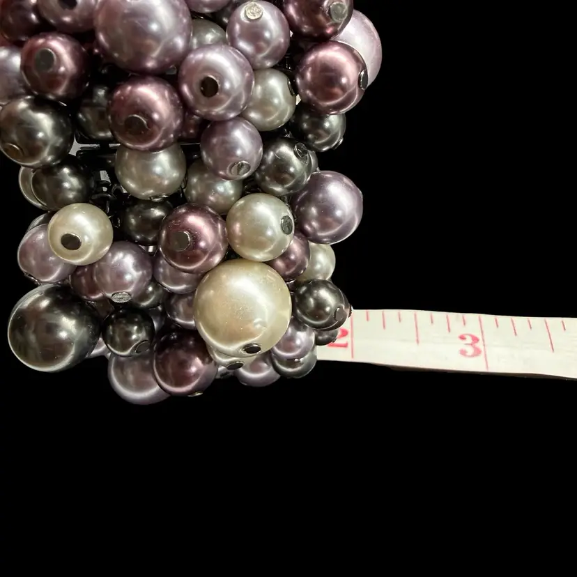 This beaded stretch bracelet features faux pearls in shades of purple, gray, and champagne, making it a statement piece for women who love bold accessories. Made from elastic and acrylic materials, this bracelet is designed with a cha cha bauble style that adds a playful touch to any outfit. The vintage-inspired piece is perfect for those who enjoy a bohemian or contemporary look, and its maximum impact makes it a standout addition to any jewelry collection. Ideal for those who appreciate unique and eye-catching accessories.
