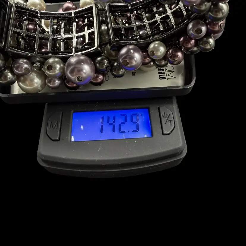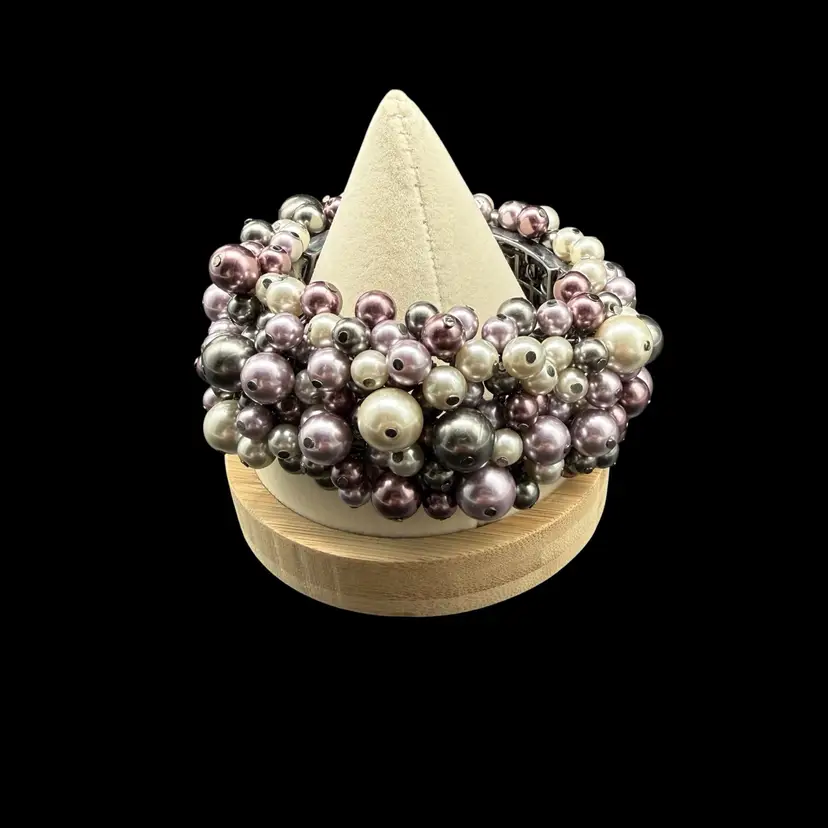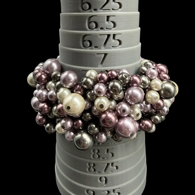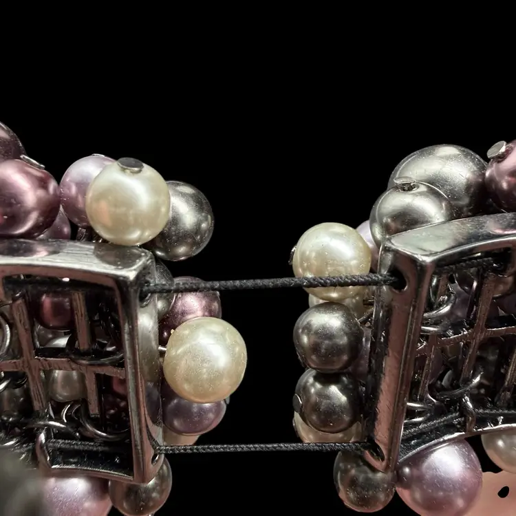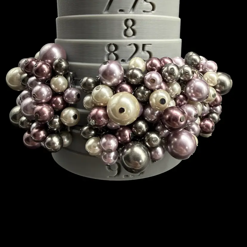 This beaded stretch bracelet features faux pearls in shades of purple, gray, and champagne, making it a statement piece for women who love bold accessories. Made from elastic and acrylic materials, this bracelet is designed with a cha cha bauble style that adds a playful touch to any outfit. The vintage-inspired piece is perfect for those who enjoy a bohemian or contemporary look, and its maximum impact makes it a standout addition to any jewelry collection. Ideal for those who appreciate unique and eye-catching accessories.