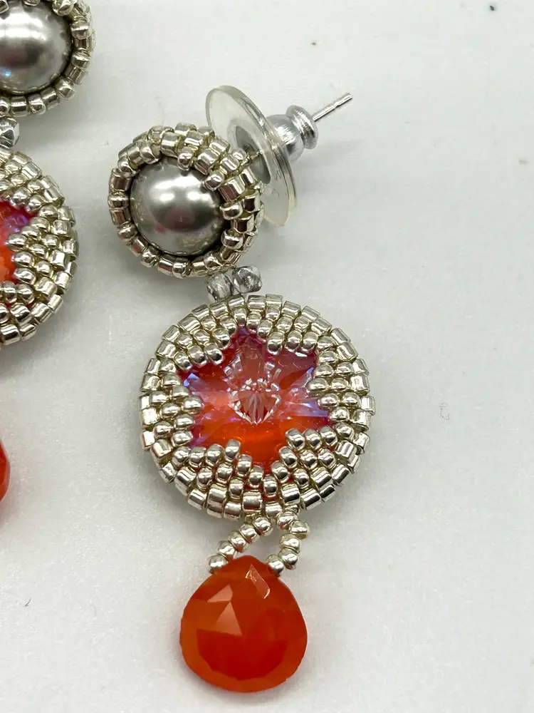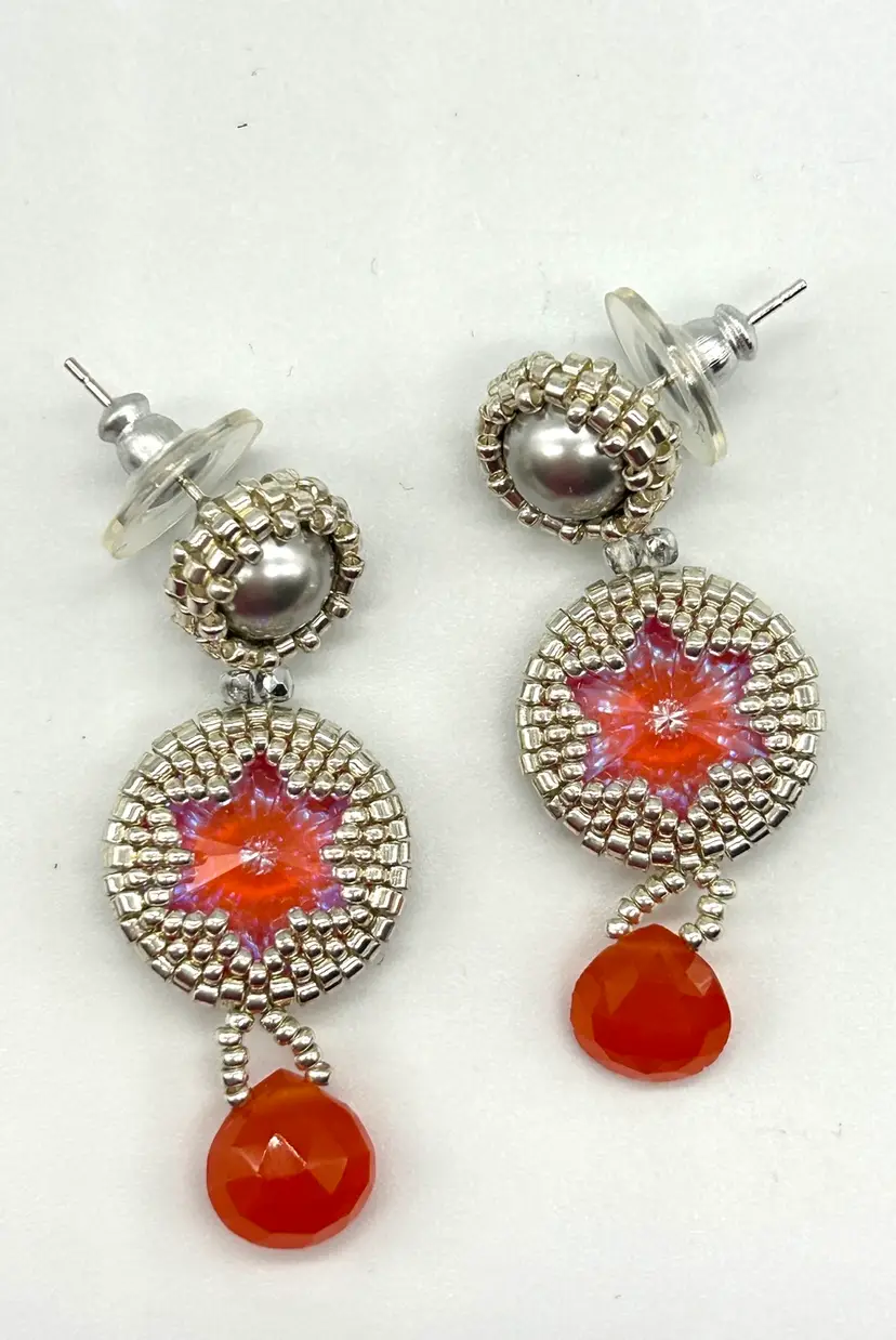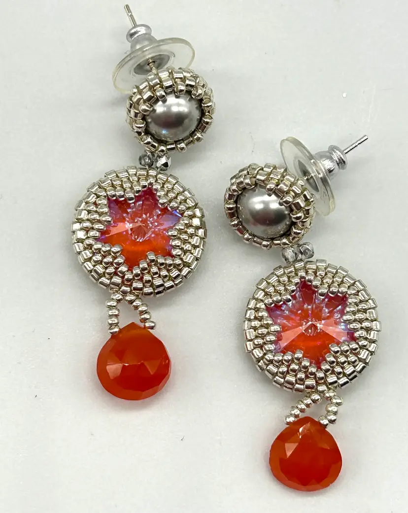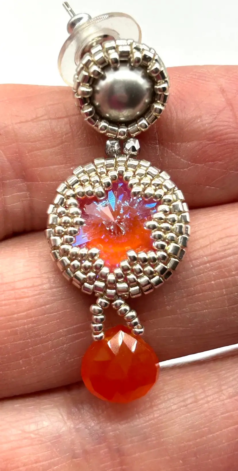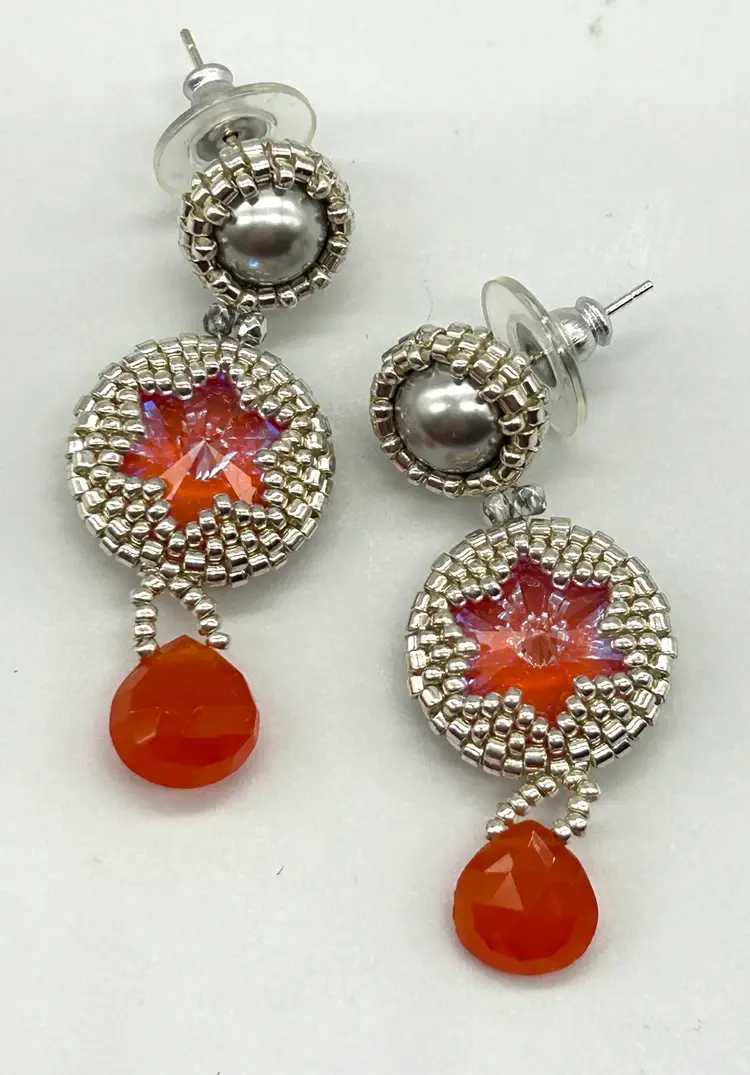 Hand beaded by me in my Seattle studio, these dangle star earrings are light weight and easy to wear. Posts are surgical steel for pierced ears. Earrings measure 1.75” long. Swarovski is no longer selling these rivolis and us beaders will not be able to get any more.