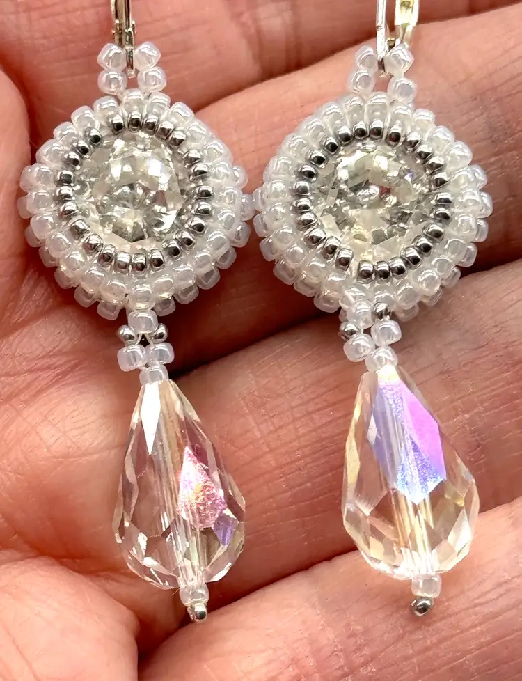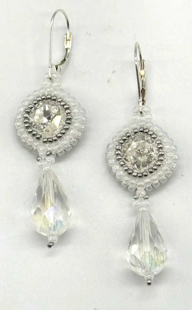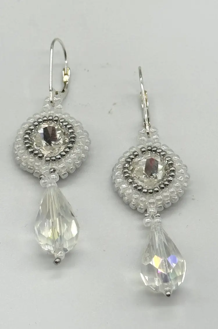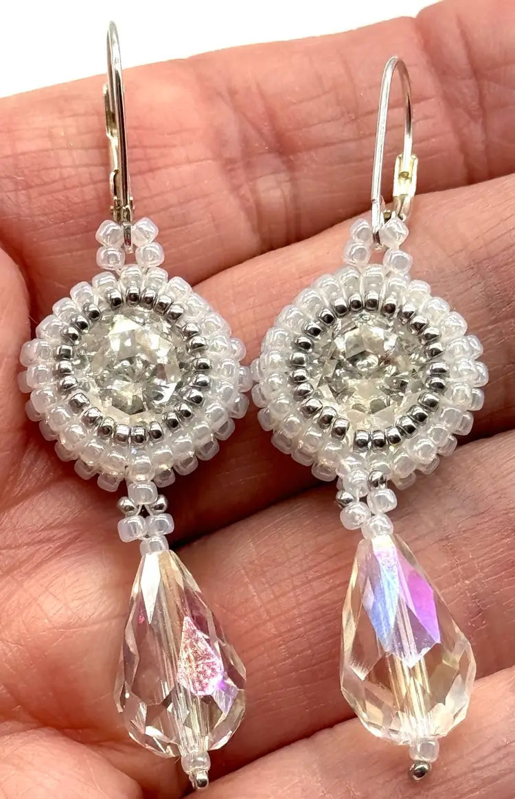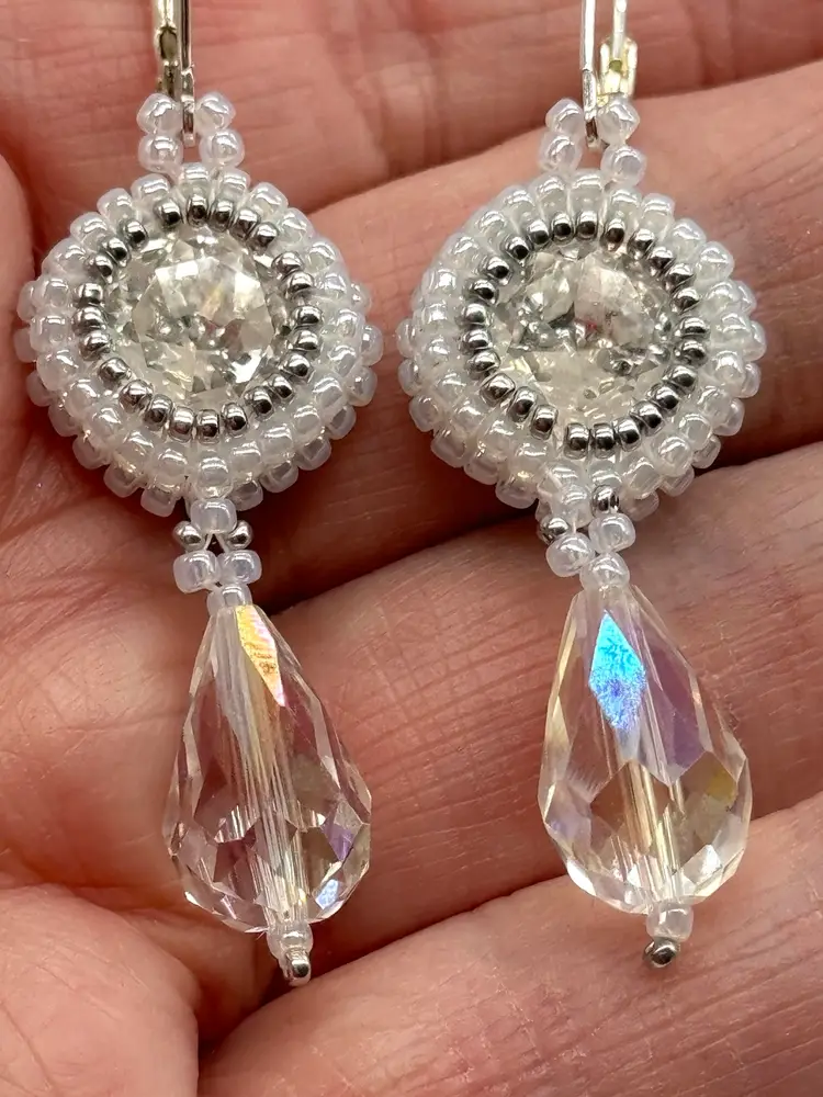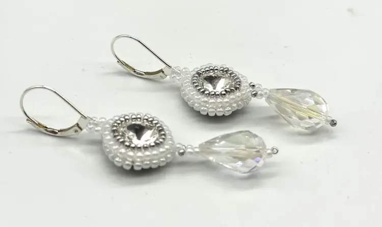 Wedding white dangle earrings beaded by me in my Seattle studio. White combined with silver and Austrian crystal, with Swarovski crystals are as light as a feather. Earrings measure 2.25” long.offers silver plated lever backs