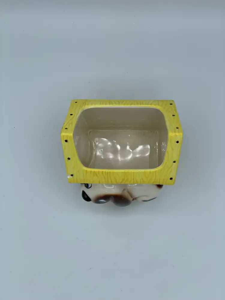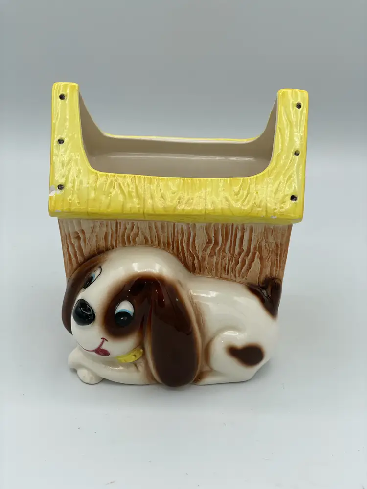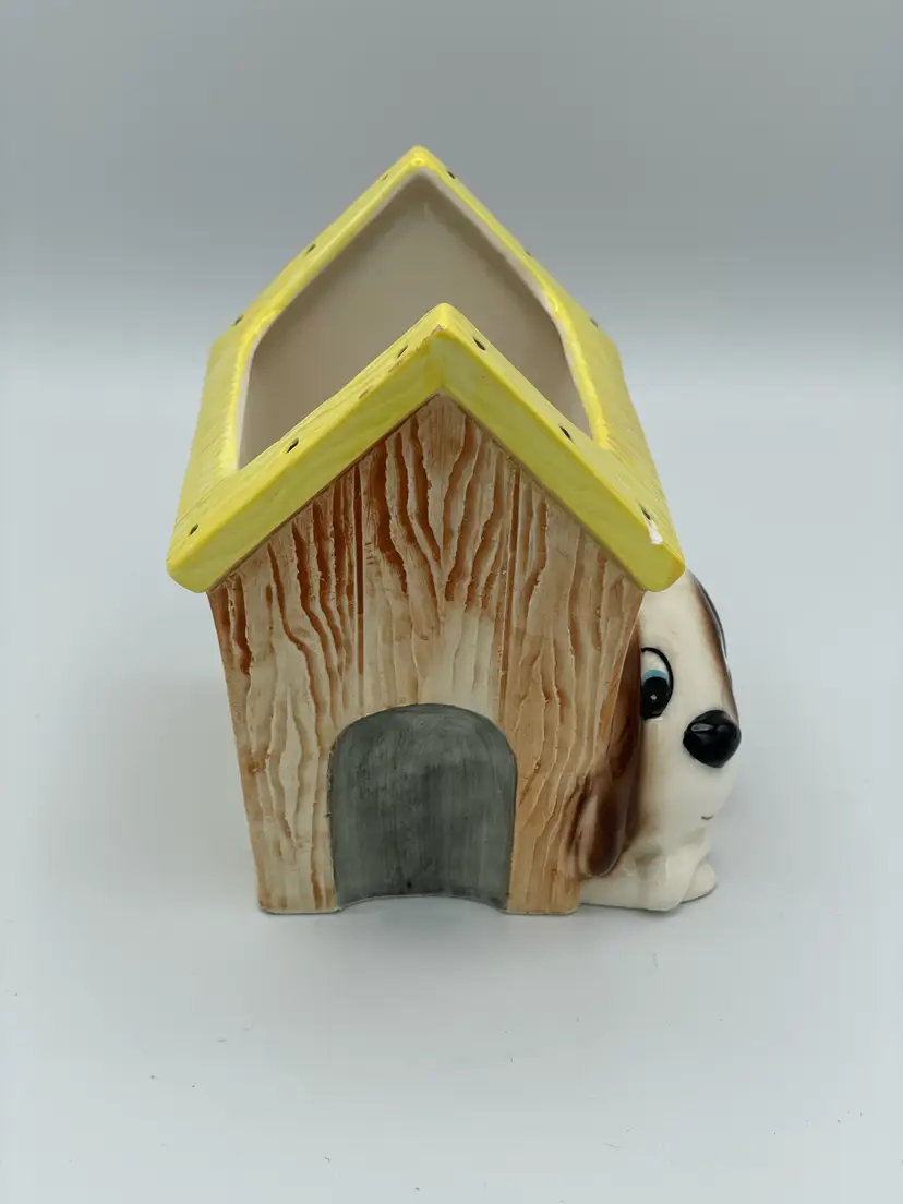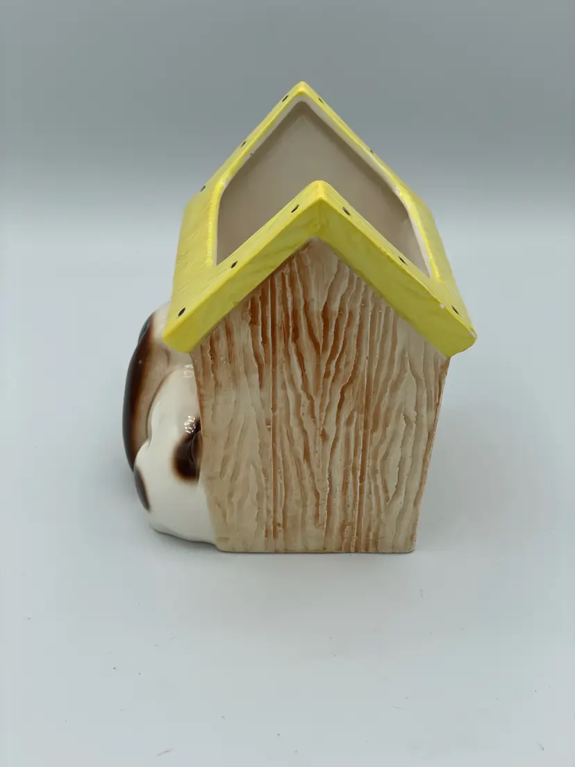 Vintage Beagle With Dog House. Ceramic. Small Chip on Yellow Part of Dog House. Planter. 4 1/2" Tall X 4" W X 3.5"