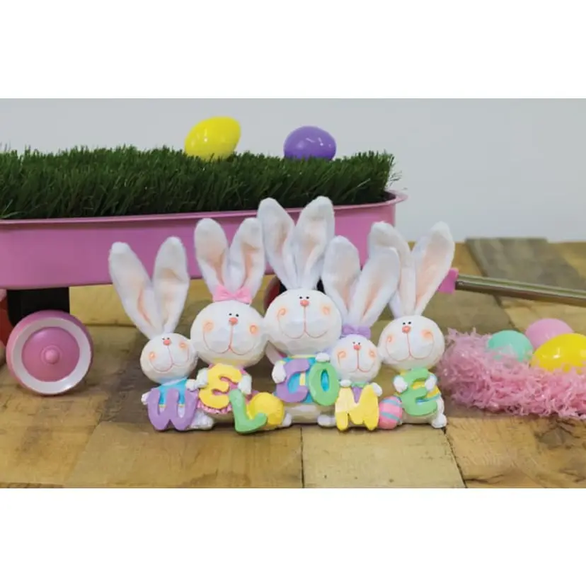 Beaming Bunny Welcome Décor. This Adorable Set is perfect for any mantle or table center piece. As these cute bunnies carry their adorable welcome sign to any party!!