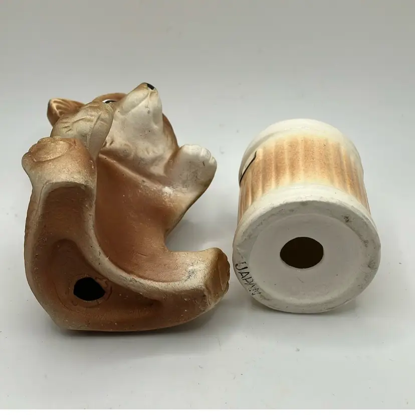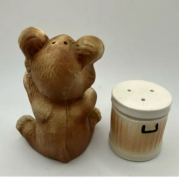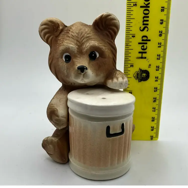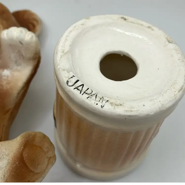 Can is marked Japan on bottom. No stoppers. Bear has 2 holes, trash can has 3. Good condition- only on chip on bottom of can (see pics)