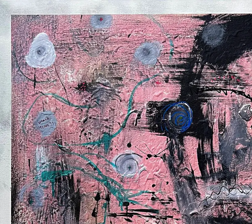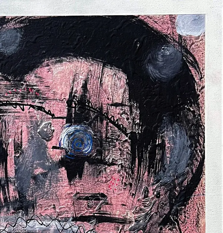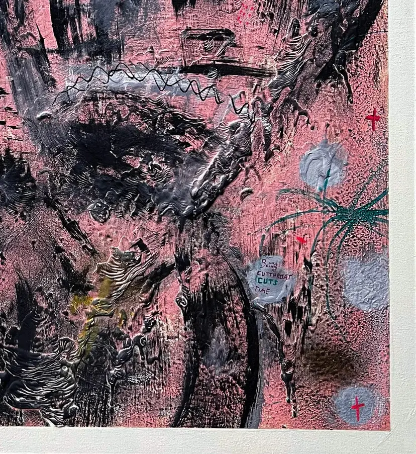 Phrases like “Wanna trade???” and “Being cutthroat cuts time” are embedded like scars — cryptic thoughts that surface in the storm of personal battles. Every mark on the canvas is intentional, yet unfiltered — a visual echo of carrying burdens that no one else can lift.