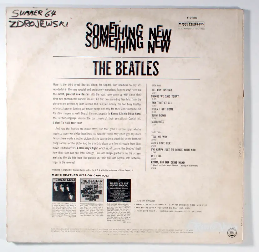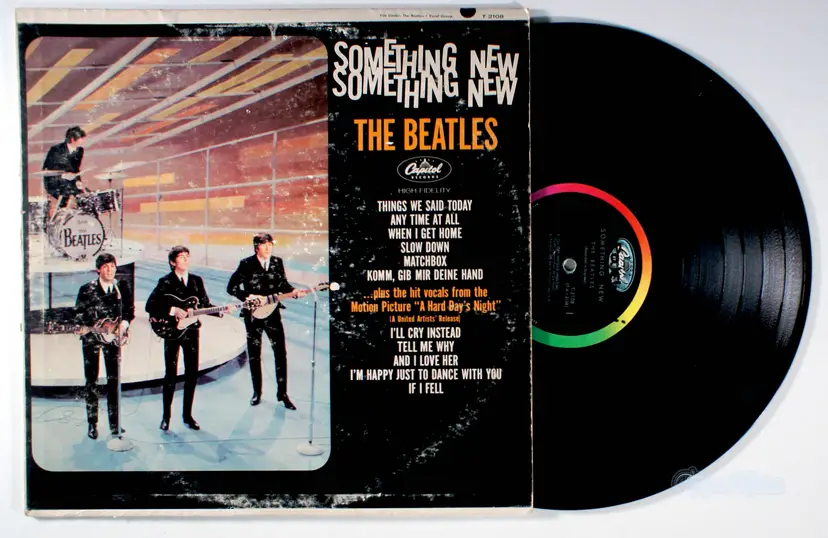 Something New, by Beatles, released on July 20, 1964, in the United States by Capitol Records, is a compilation of tracks primarily drawn from the UK version of A Hard Day's Night, alongside other recent recordings. It features a mix of original compositions and covers, showcasing the band's evolving songwriting and energetic performances during their early Beatlemania peak. Historically significant as part of Capitol's strategy to maximize the Beatles' U.S. market presence, the album was one of several American releases that repackaged UK material, often with different track listings, to capitalize on the band's skyrocketing popularity. Hit singles from the album include Ain't She Sweet and I'll Cry Instead, the latter reaching No. 25 on the Billboard Hot 100. The album itself peaked at No. 2 on the Billboard 200, reflecting the Beatles' dominance in the U.S. charts during 1964.