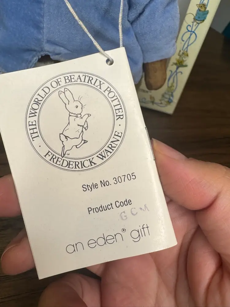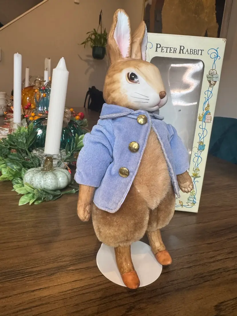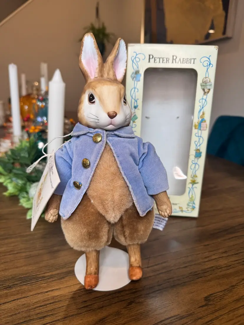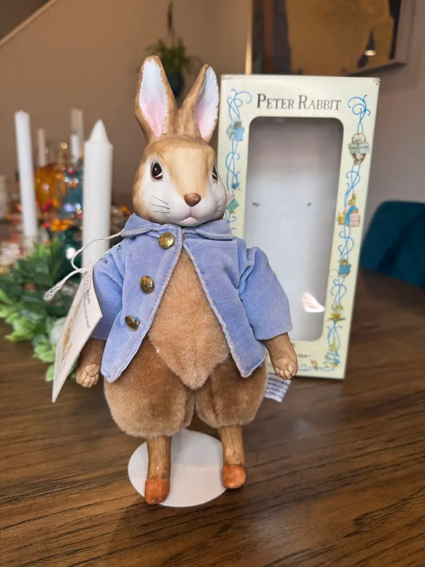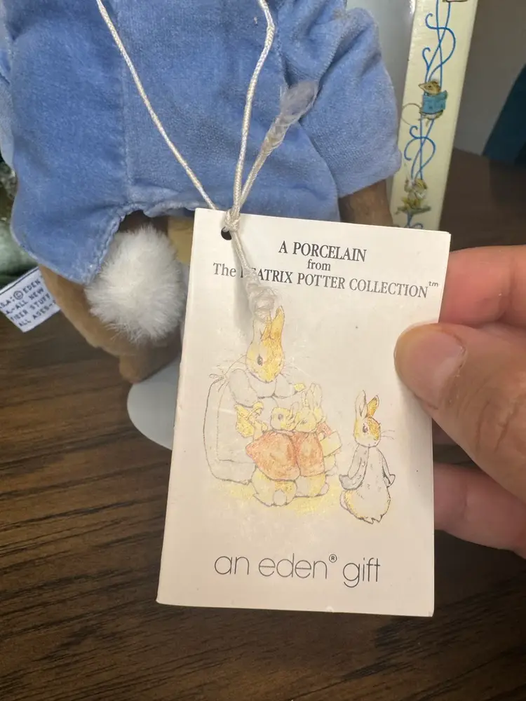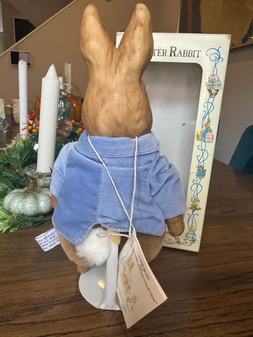 A PORCELAIN from The BEATRIX POTTER COLLECTION PE TER RABBIT DISTRIBUTED BY EDEN TOYS--1987 PETER HAS A PORCELAIN HEAD, HANDS, AND FEET, BUT A PLUSH BODY. DRESSED IN A LIGHT BLUE VELVET JACKET WITH GOLD BUTTONS. PETER COMES WITH STAND AND MEASURES 11"TALL. PORCELAIN IS IN EXCELLENT CONDITION--NO CHIPS OR CRACKS!! DOLL COMES WITH ORIGINAL TAG ON STRING AROUND NECK THAT TELLS THE STORY OF BEATRIX POTTER, A BRIEF BIO OF PETER RABBIT, AND HISTORY OF EDEN TOYS. PETER COMES IN ORIGINAL DISPLAY BOX. BOX IS IN GOOD CONDITION .