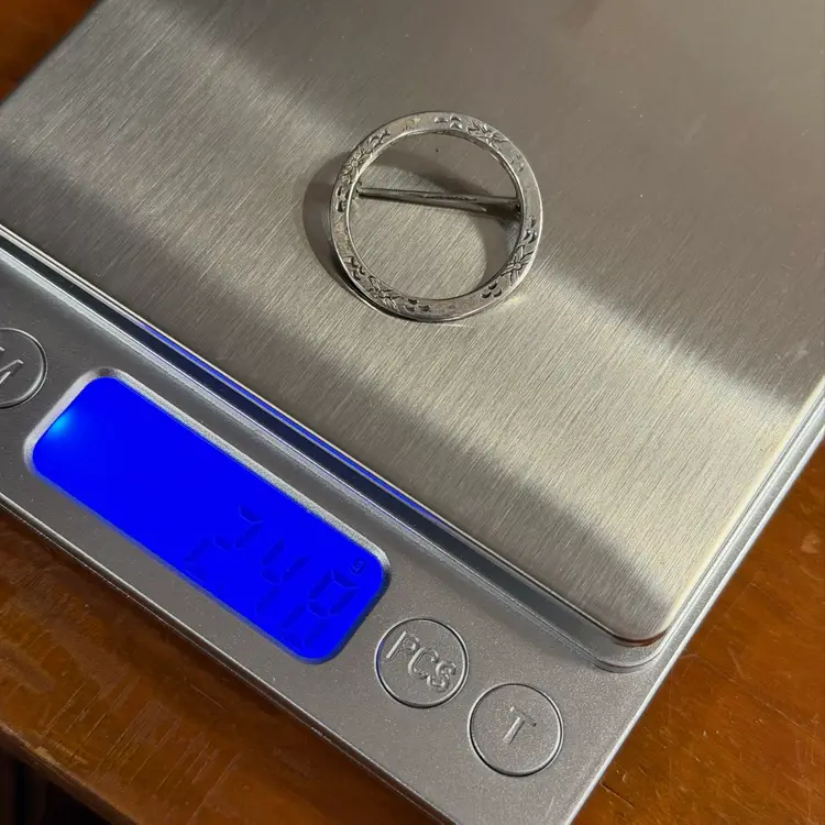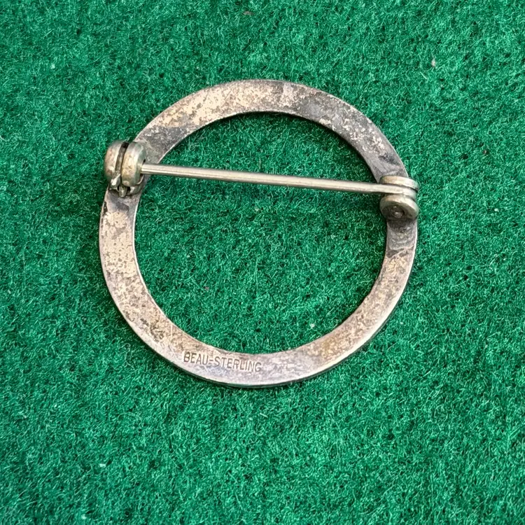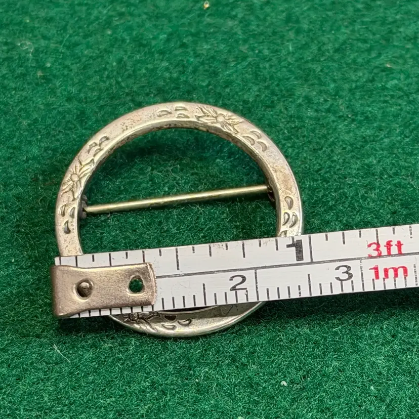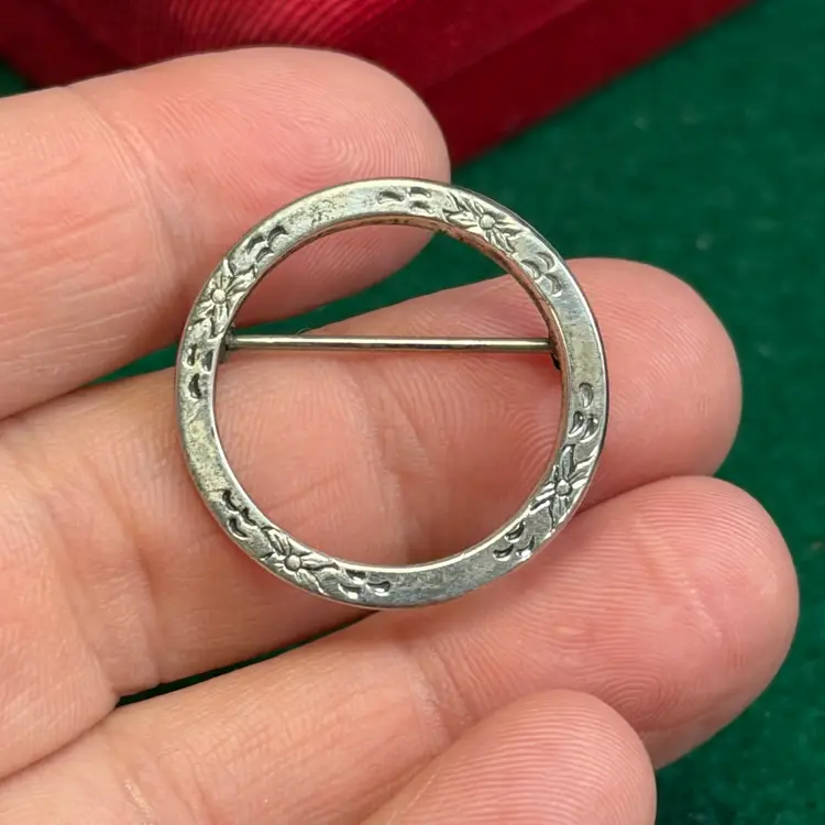 This lovely little brooch is a floral carved circle That is about 1 inch wide. It is acid tested and marked sterling