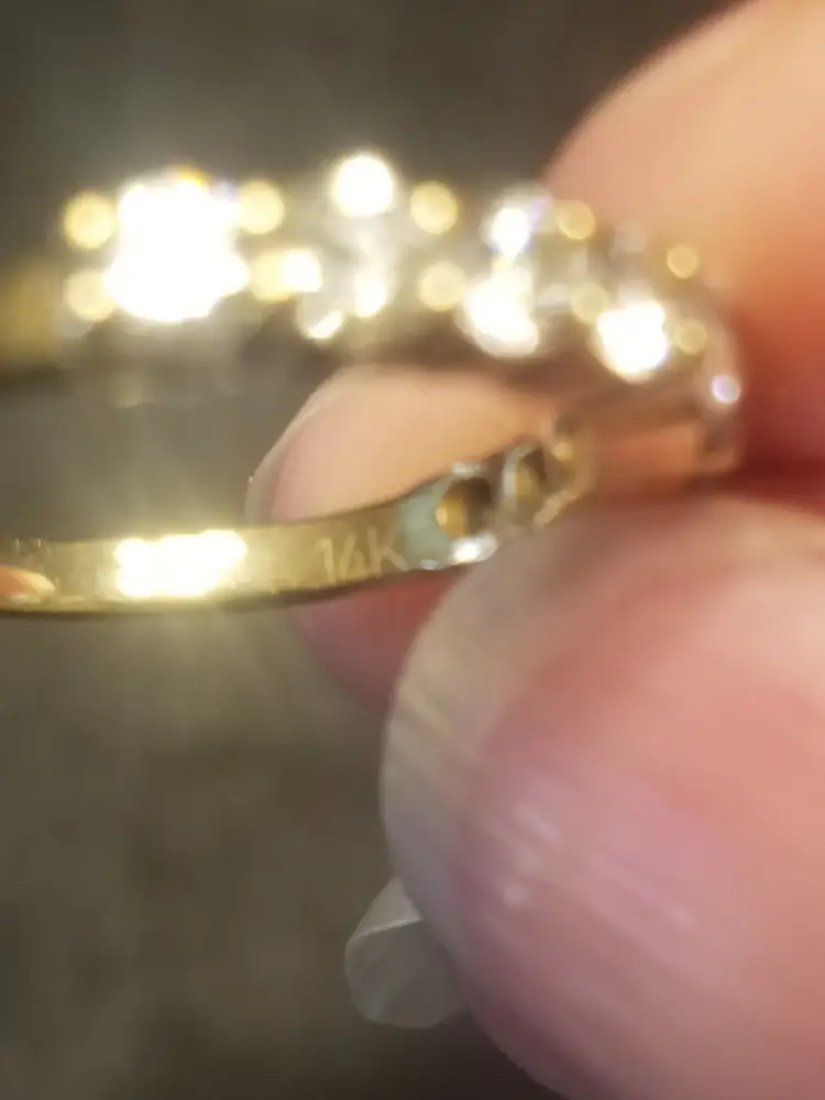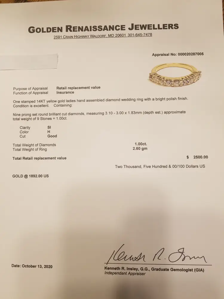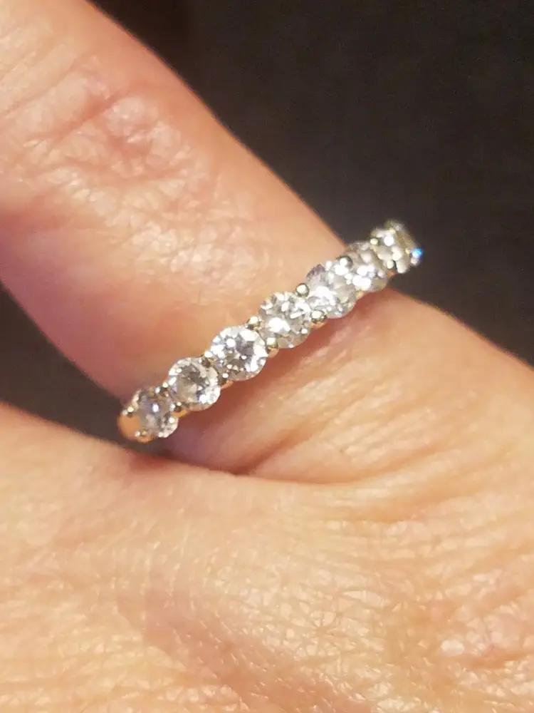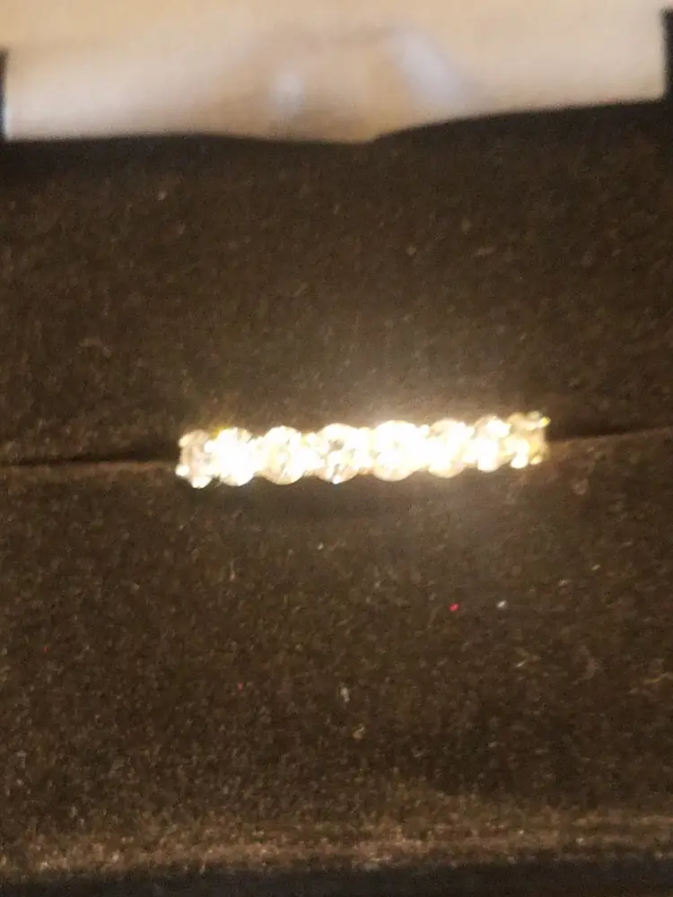 Beautiful Nine-Stone Ring has a total of nine round brilliant cut diamonds with total carat weight 1.0. Diamond color is H and Clarity SI. Ring size is 5.5 with Len x Wid 0 x 5.5. They are set in a 14 kt yellow gold band. Ring is about 5-6 years old with only one previous owner. This ring comes with a recent appraisal. Would make a wonderful engagement ring or right hand ring.