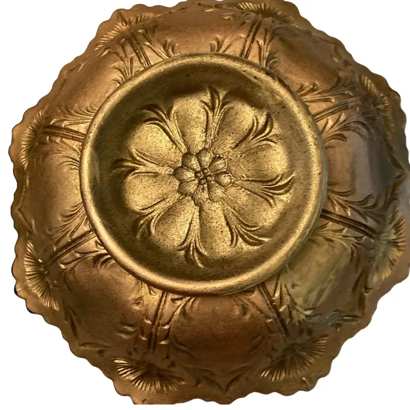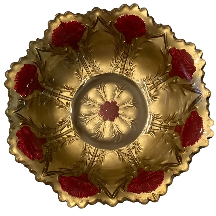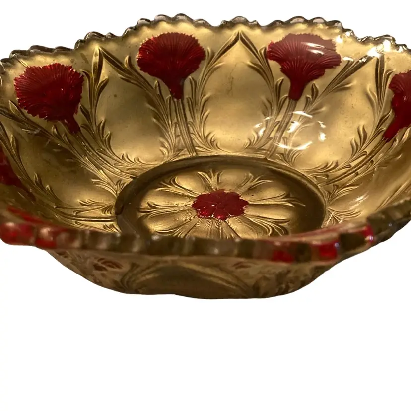 Bowl is in good condition. It is painted from the outside gold with red flowers. 2” tall, scalloped edge.