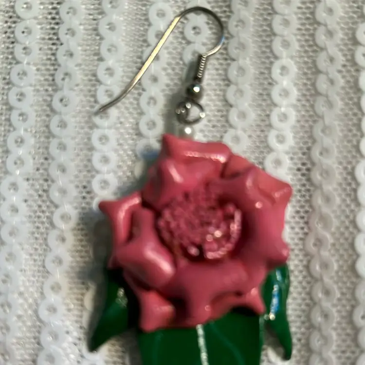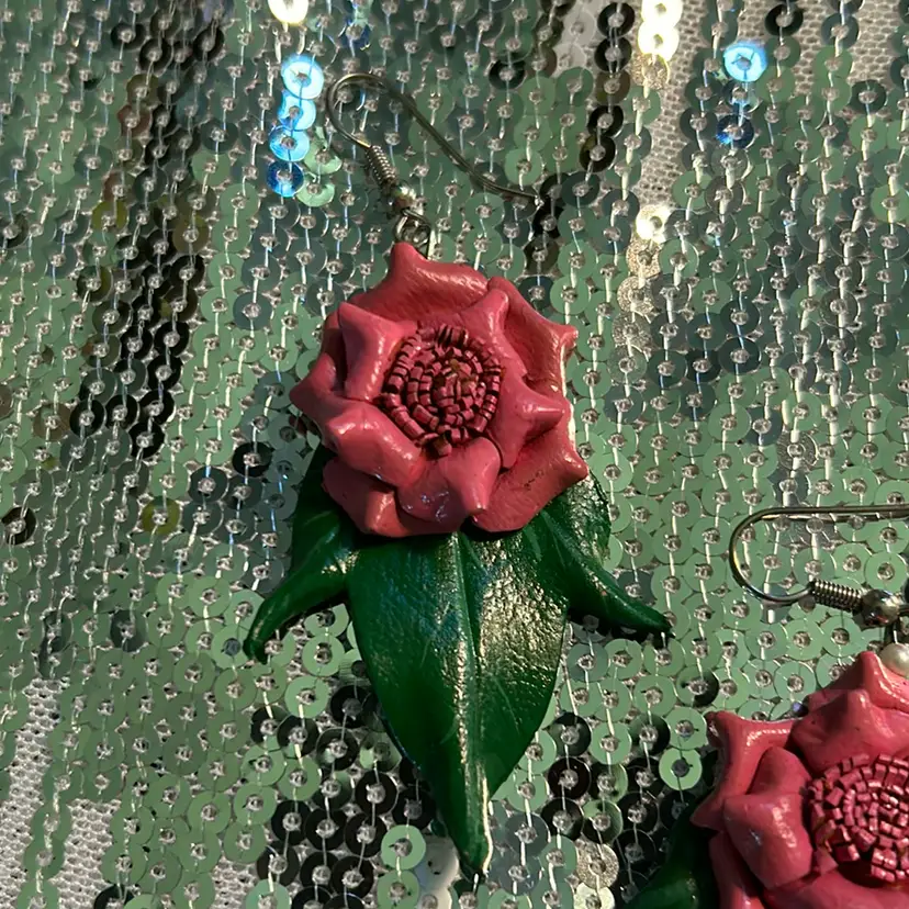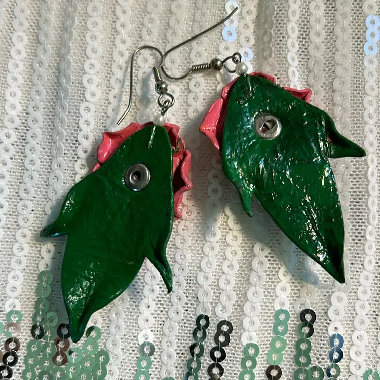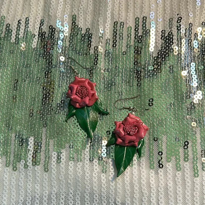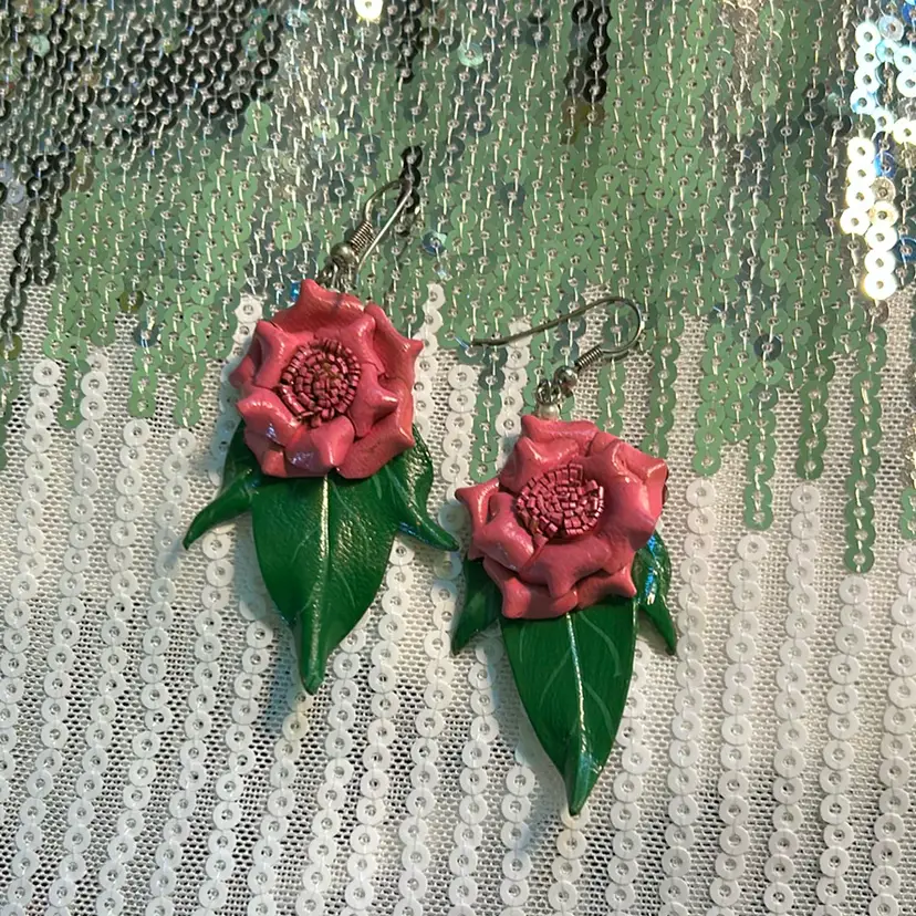 Beautiful 80’s Leather Pink And Green Flower Pierced Earrings. Measures 2 inches from top to bottom and an inch across. Perfect vintage condition. GO 80’s‼️‼️ all earrings cleaned and disinfected