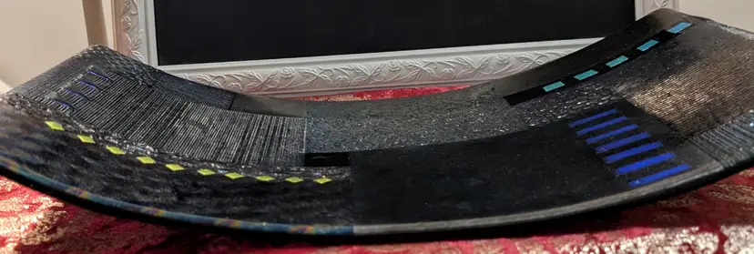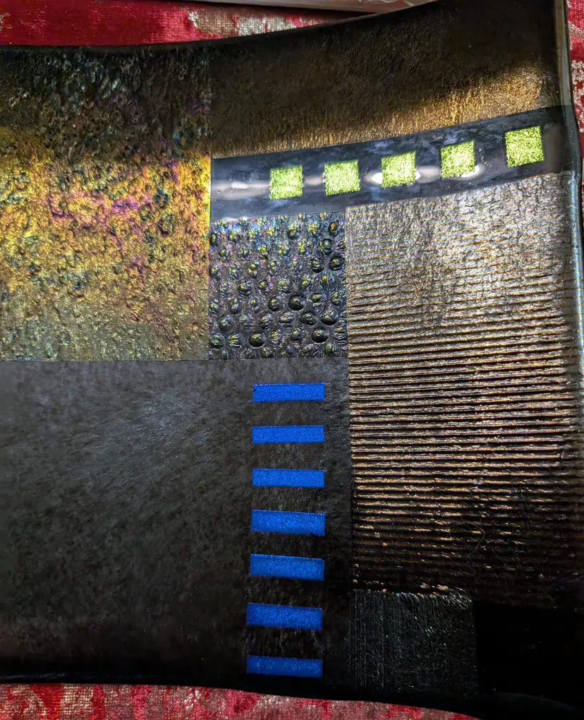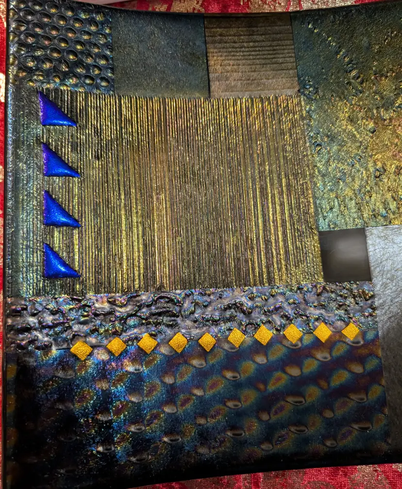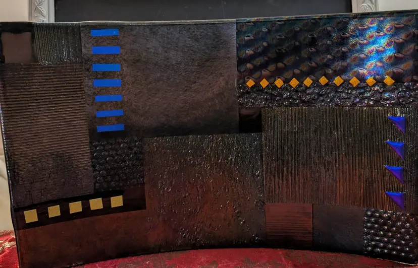 Beautiful abstract design '80's style curved fused centerpiece plate. Piece is in amazing condition with no chips or cracks and is signed and dated by artist The first name of artist appears to be Lisa but the last name is hard to make out and is dated in 2007. This piece has multiple designs and colors with glitter and etch design. Peace is approximately 16 inches length with a 10-inch width and a 3.5 in height at curves. Very nice high-end piece that will make your home look amazing.