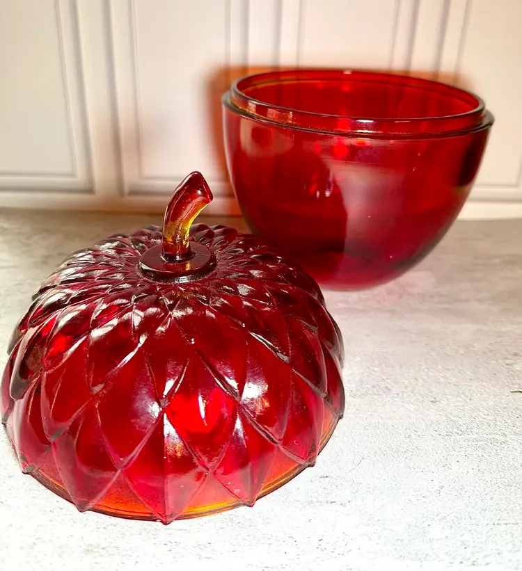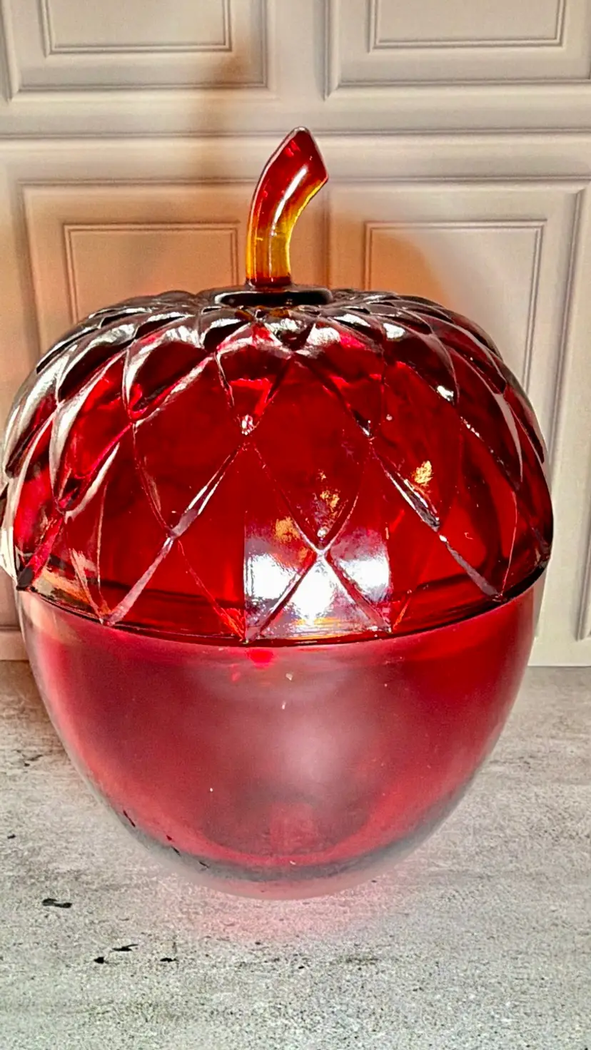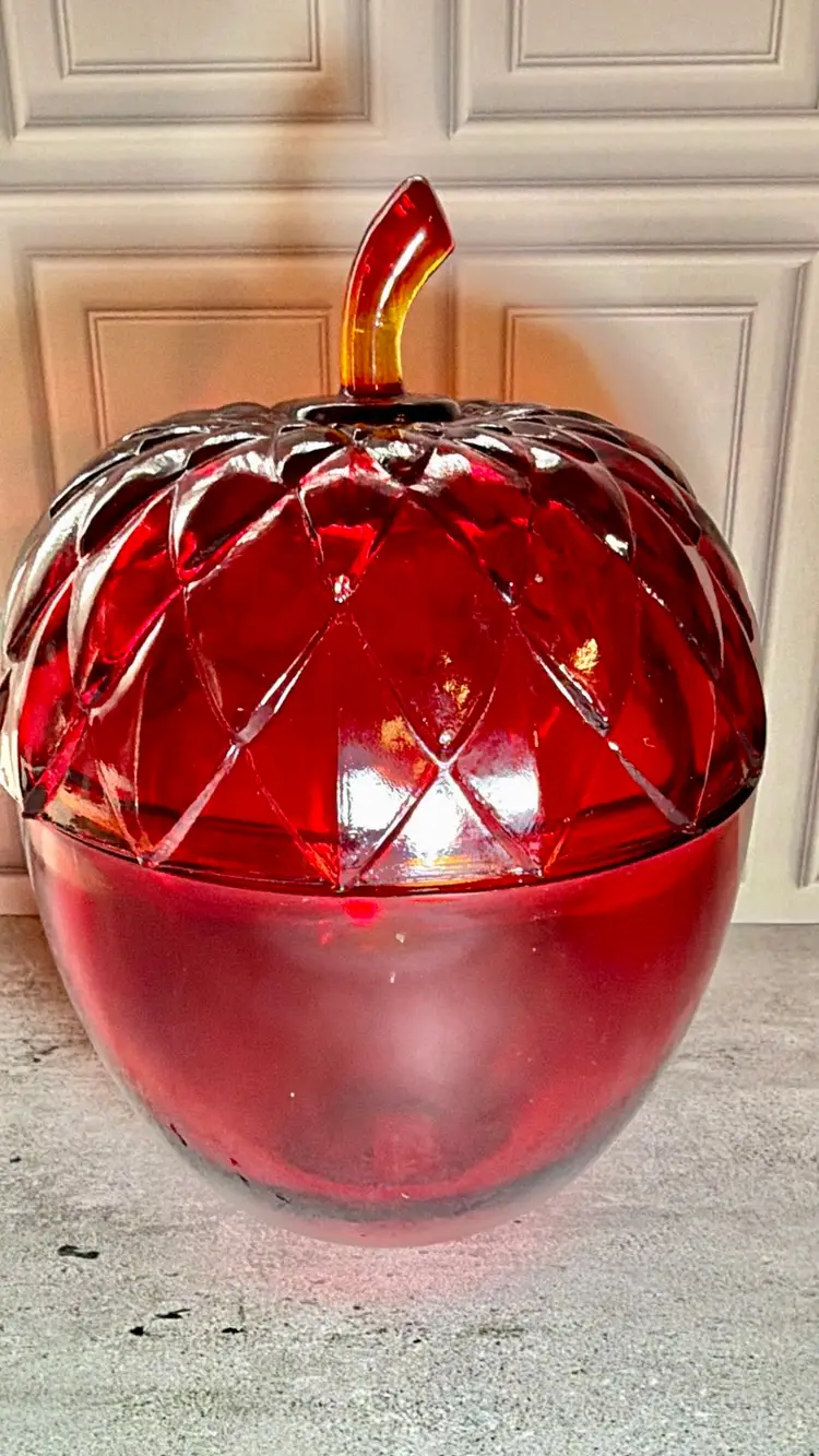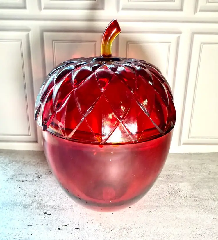 Beautiful Amberina (red/yellow) glass lidded acorn candy dish. Up your holiday game with this stunning dish! This dish would make a festive addition to any holiday decor for many years to come. Large, 8”Hx5.5”W. EUC, no chips or cracks