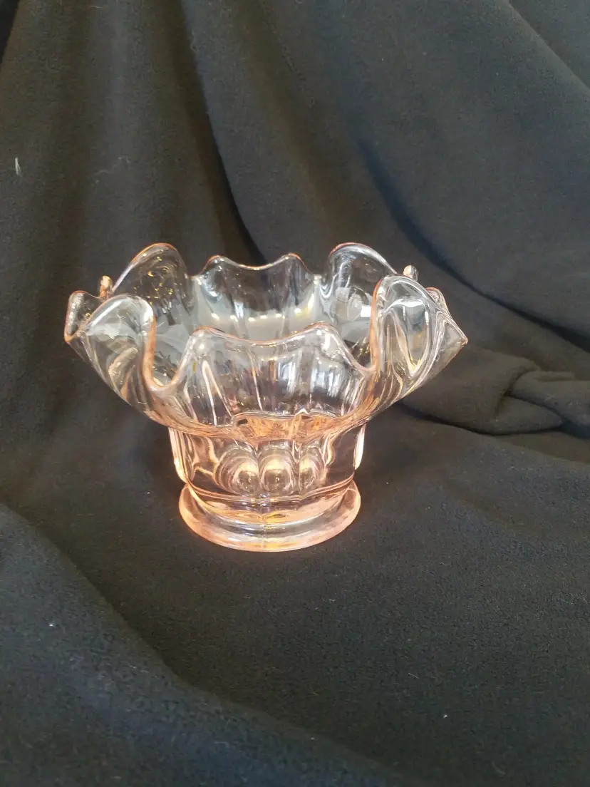 Beautiful Art Glass Bowl/Vase has a ruffled edge and is 4.25" tall x 6" wide. Has a very small chip on the edge of the base unseen when sitting upright.