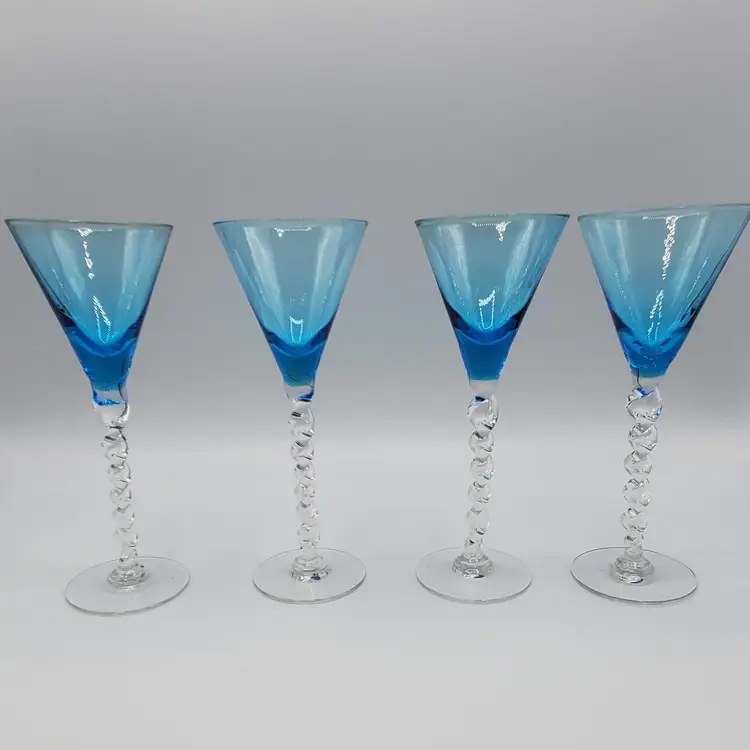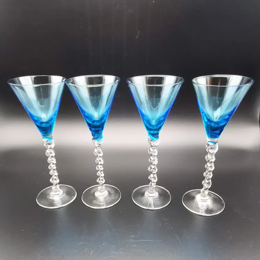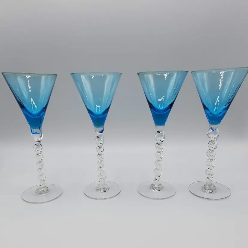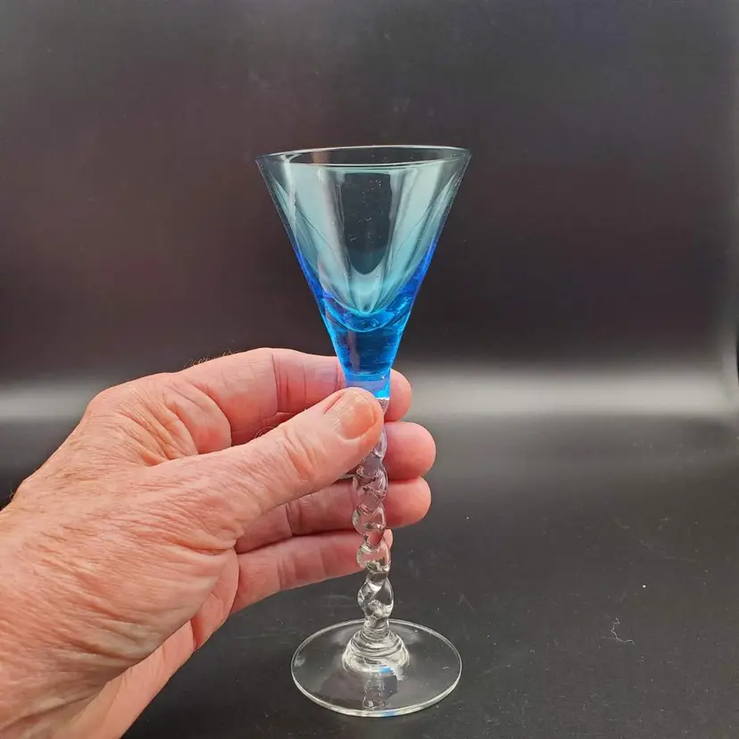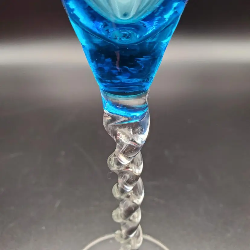Impress your guest with these beautiful vibrant blue cordial glasses with a hand blown clear glass twisted spiral stem. They are small measuring approximately 5 3/4" tall and 2" wide and in excellent condition no chips or cracks.