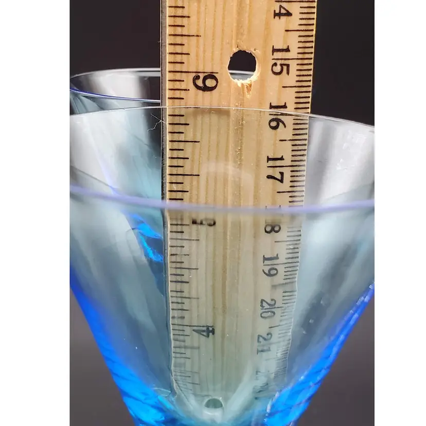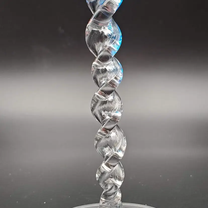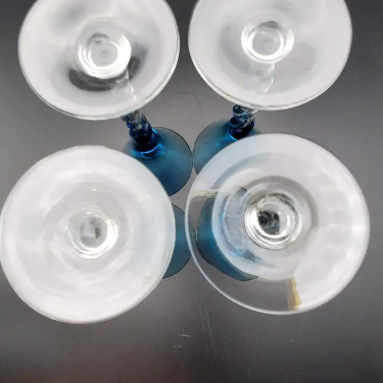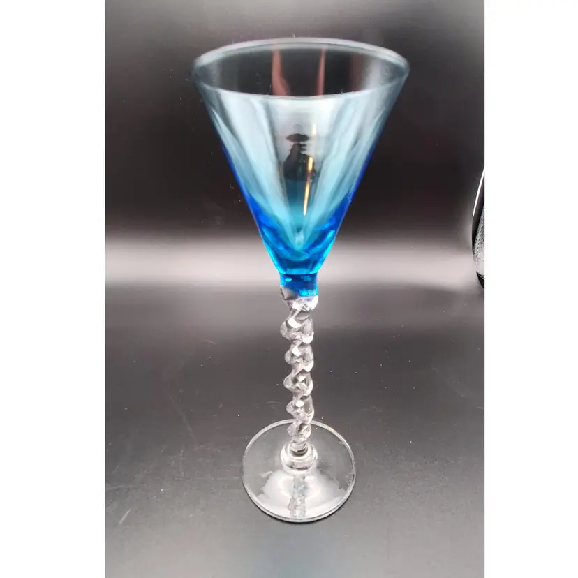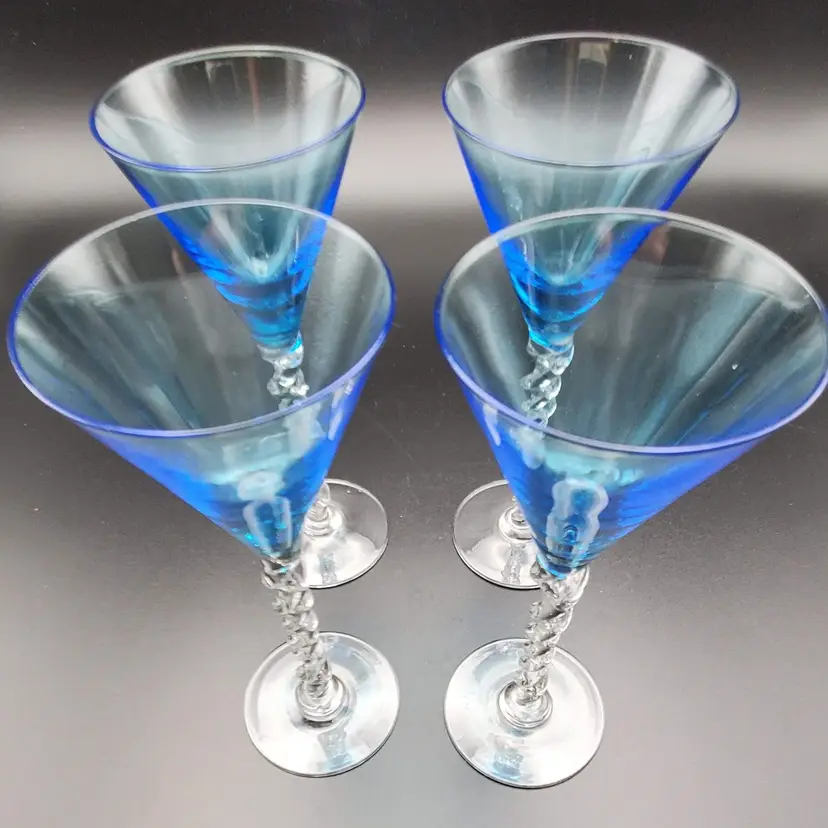 Impress your guest with these beautiful vibrant blue cordial glasses with a hand blown clear glass twisted spiral stem. They are small measuring approximately 5 3/4" tall and 2" wide and in excellent condition no chips or cracks.