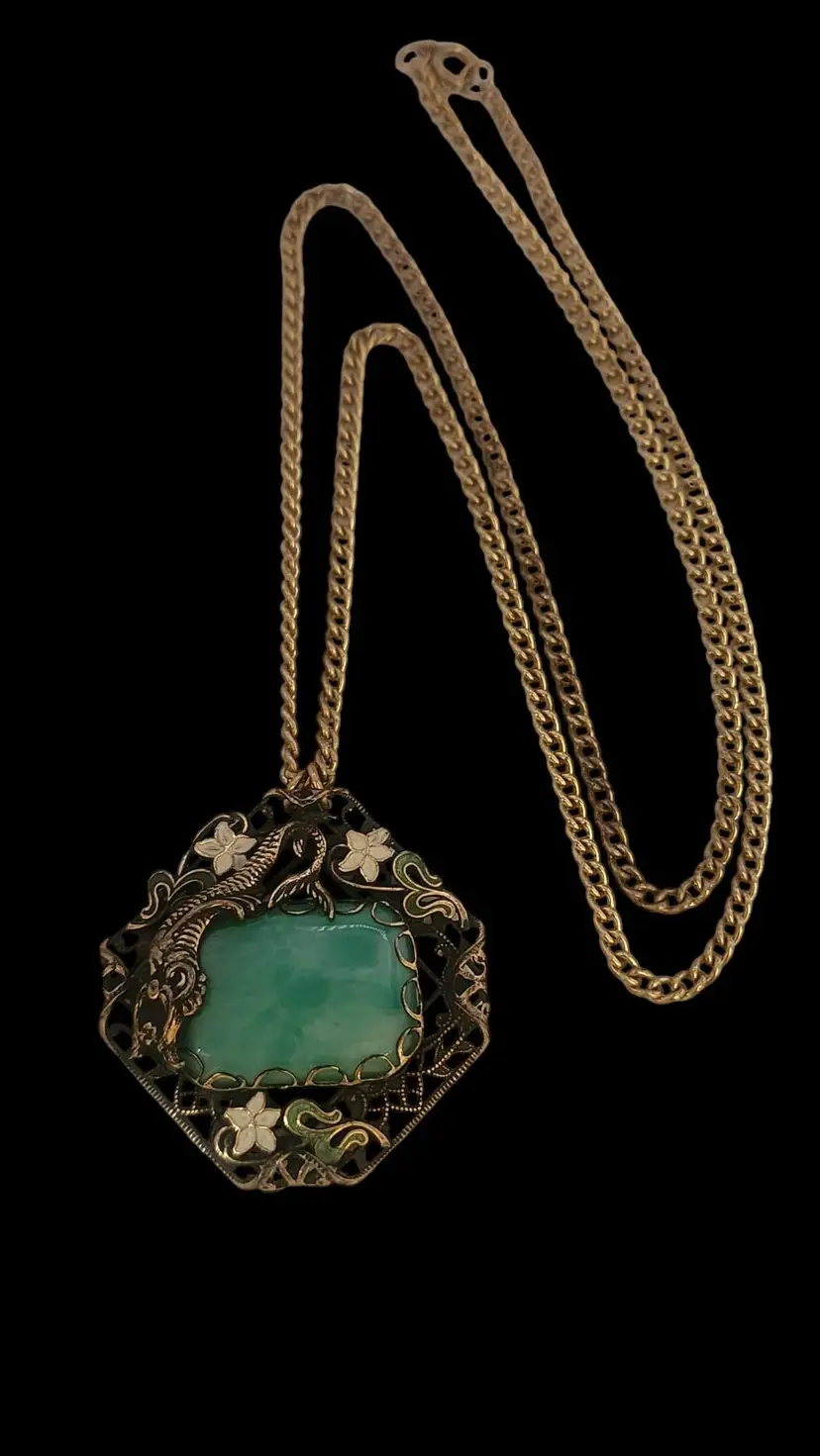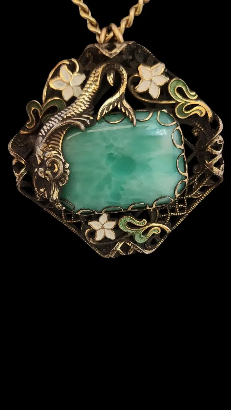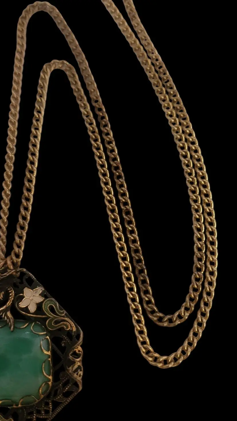 Color: Green, gold Condition: Good vintage; some darkening to the chain. Signed: None Details: Not sure if chain is original to the piece. Beautiful pendant!