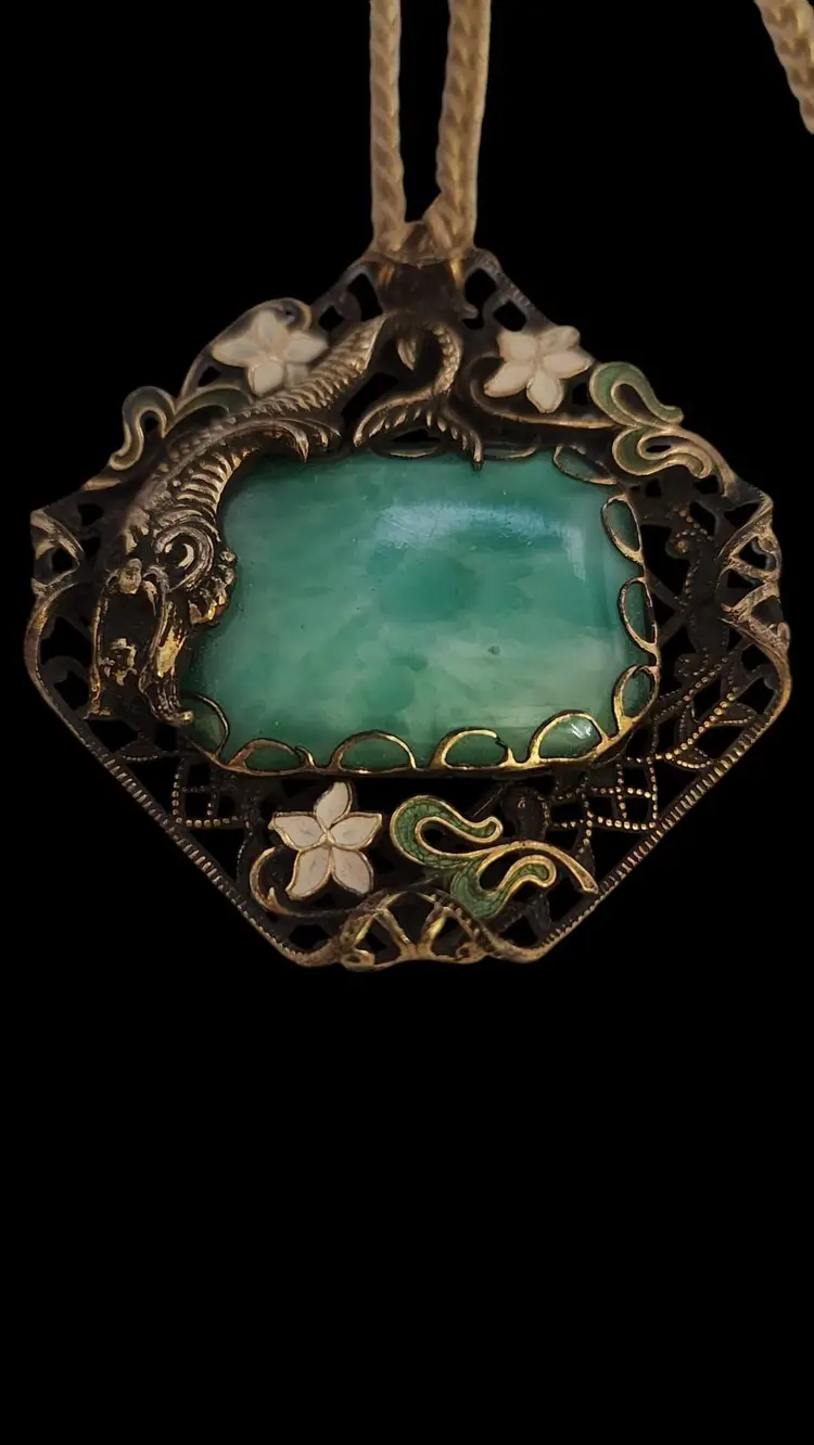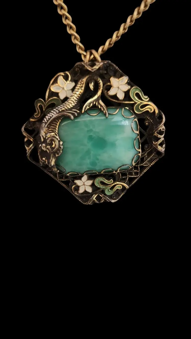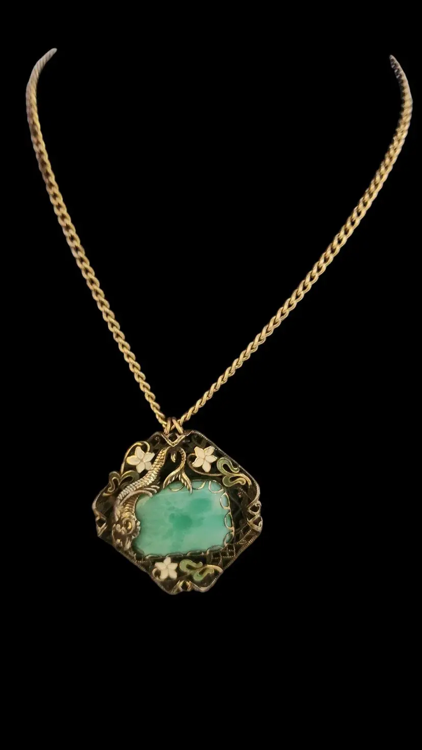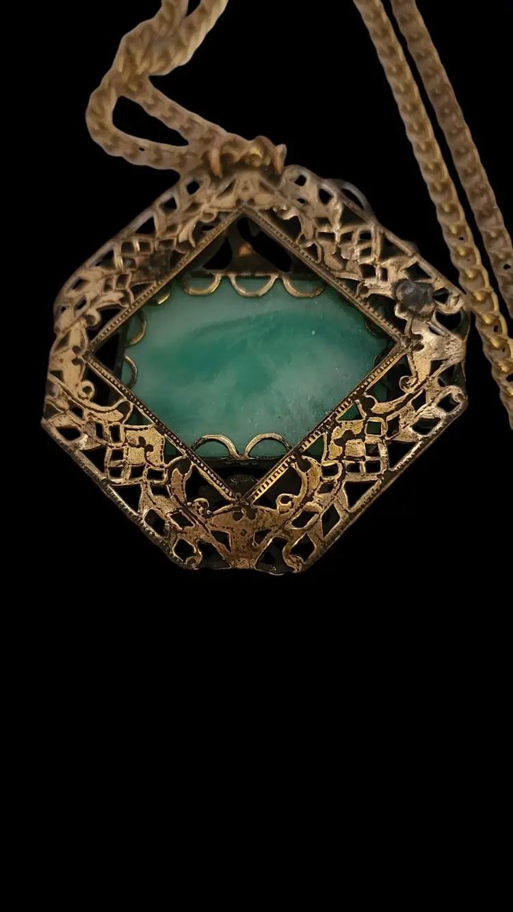 Color: Green, gold Condition: Good vintage; some darkening to the chain. Signed: None Details: Not sure if chain is original to the piece. Beautiful pendant!