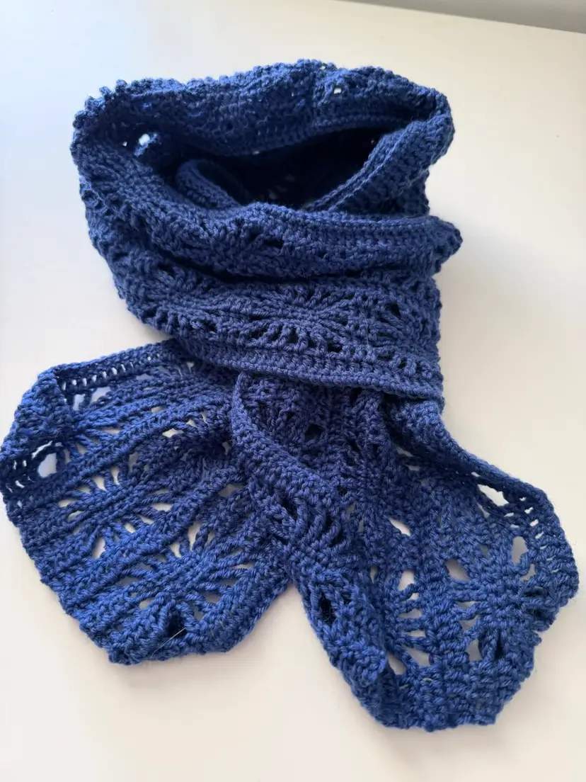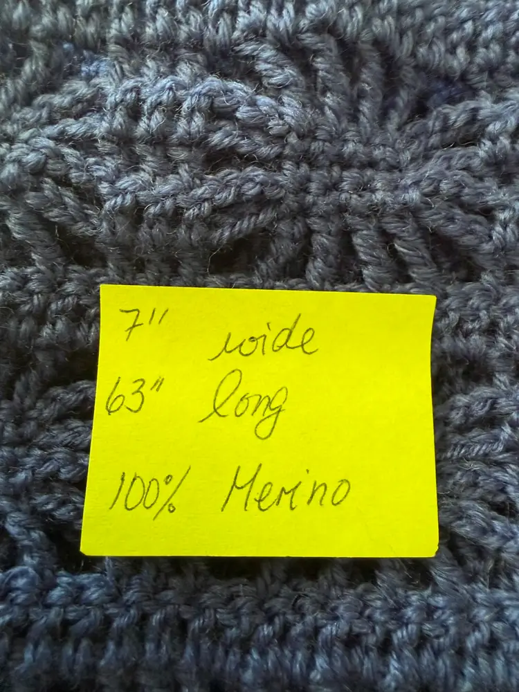 Don’t let the airy pattern fool you. This scarf will keep you cozy warm. It is long enough to wrap around your neck twice or double up and loop thru as shown.