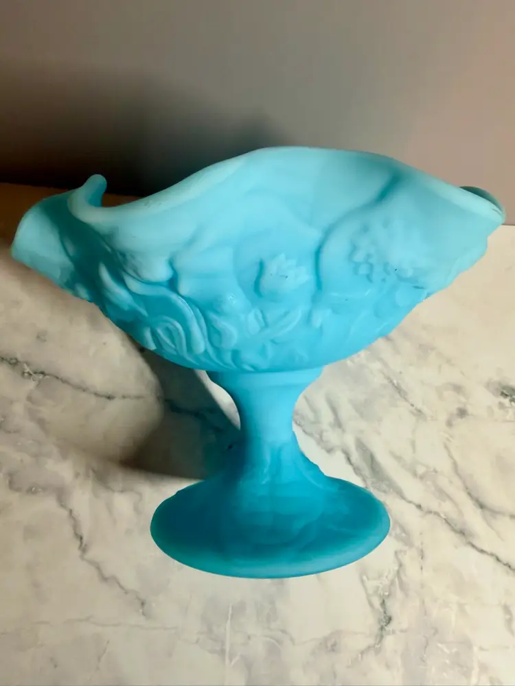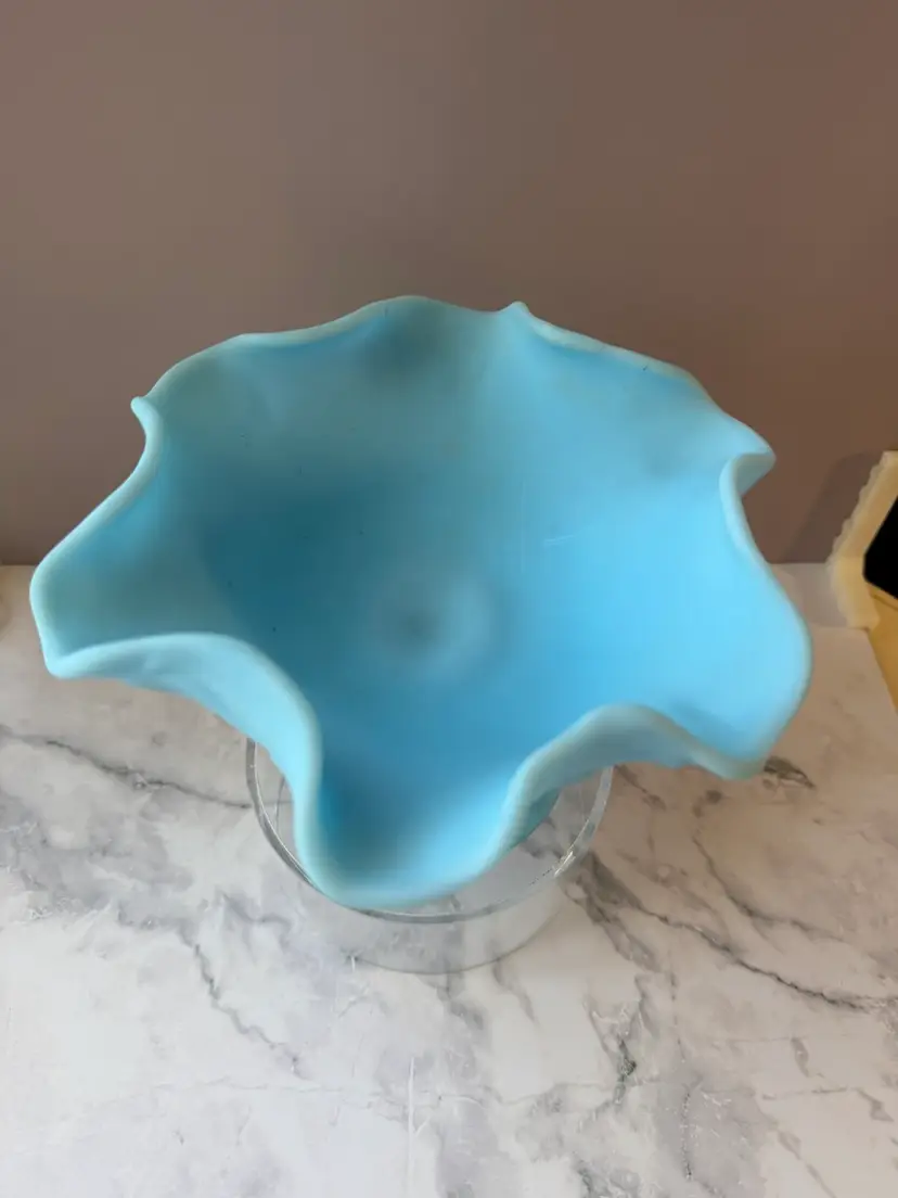 This beautiful Fenton blue satin glass ruffled edge pedestal compote/Candy dish w/lily pad design would make an elegant addition to any decor or collection of its kind. 5.25”Hx7’5”W. EUC, no chips or cracks. A few small hardly noticeable black dots from manufacturing process.