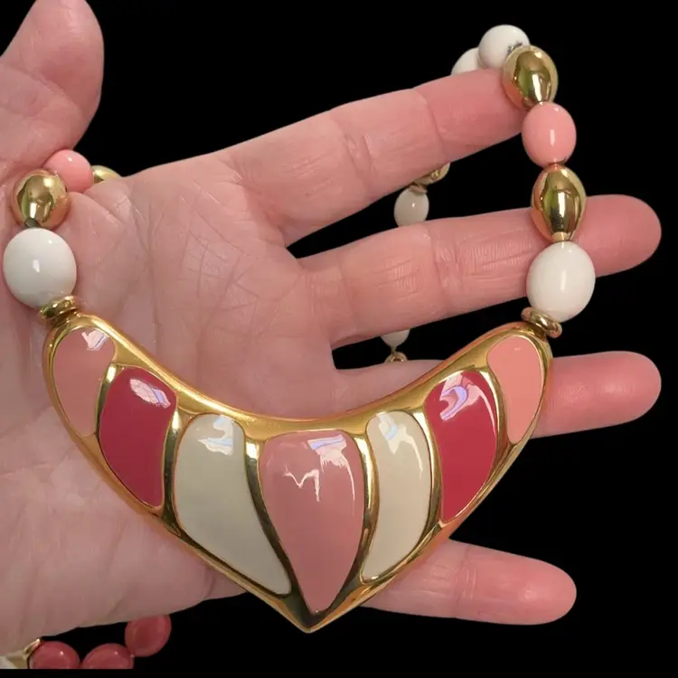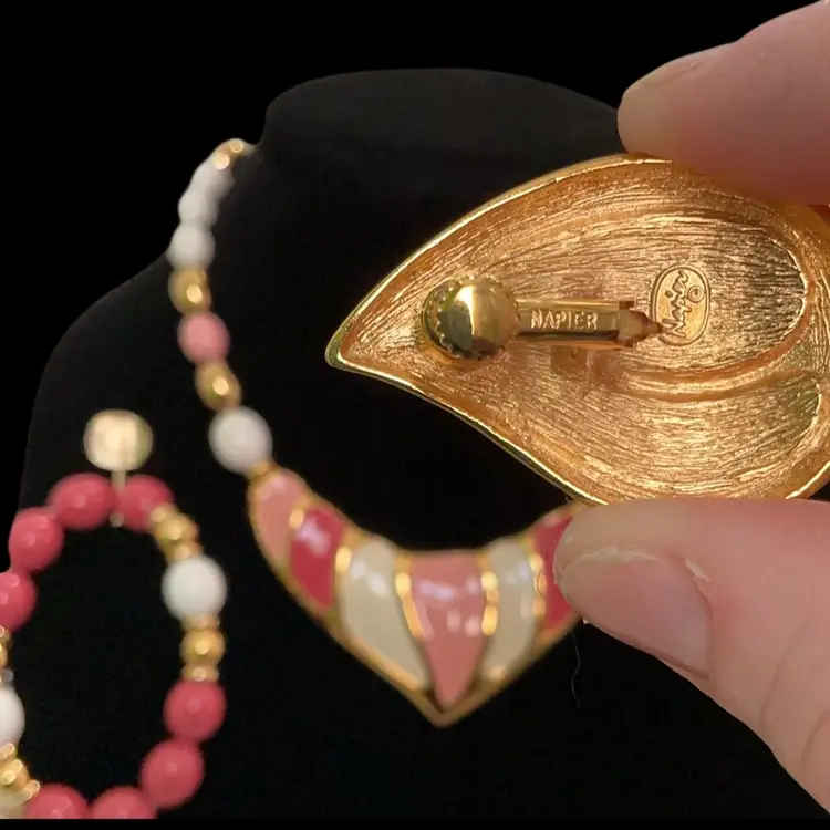 Measurements ~ Necklace 17β large pendant 3β1/2L by 2βW with foldover closure. Clip earrings are large ~ just under 2β & Bracelet stretchy like new!!! 80s are in !!! Signed Napier