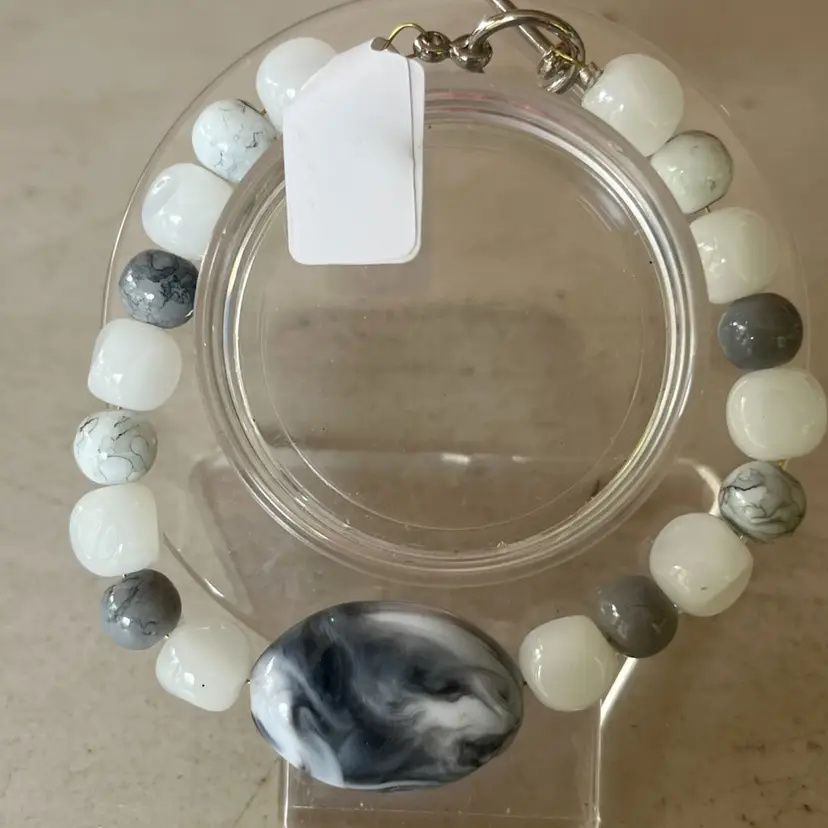 Beautiful gray and white stone and glass bracelet has a beautiful class to match it size between an eight and a 9 inch wrist