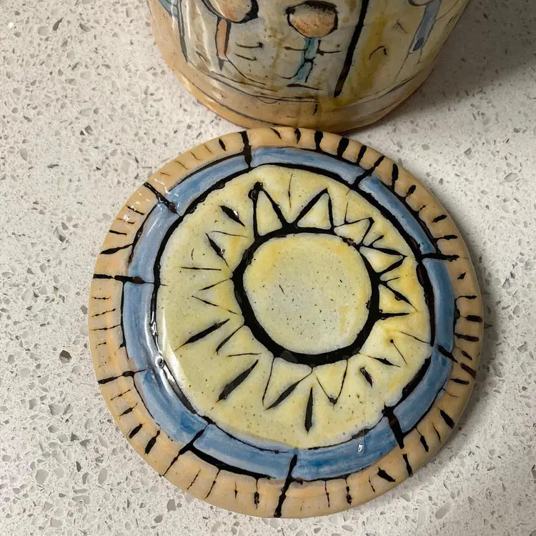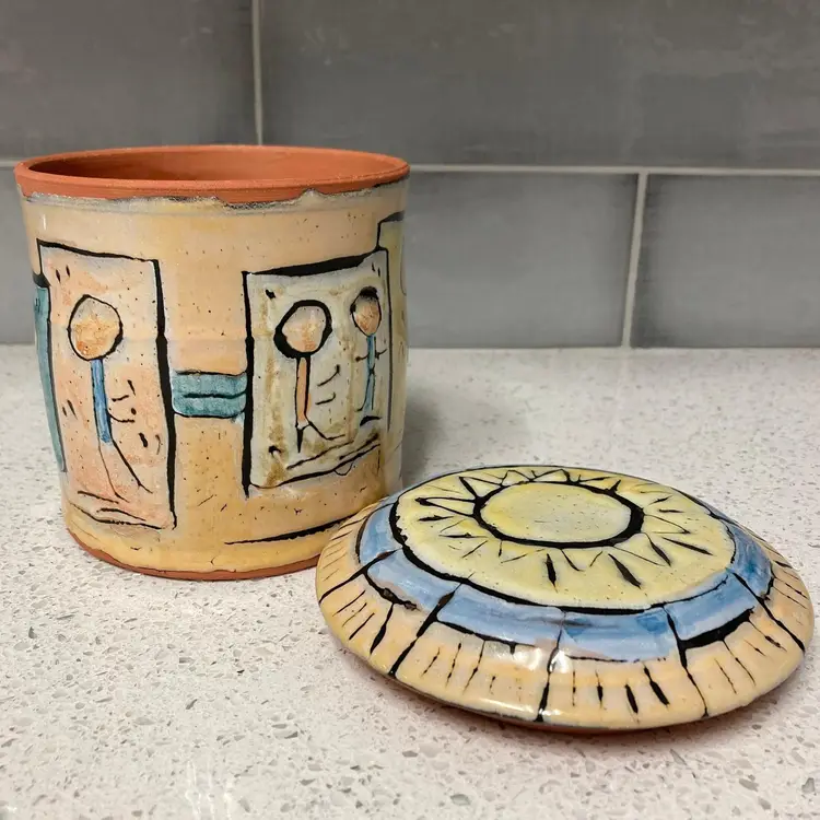 Beautiful Hand Painted Redware Glazed Jar w/Lid Sun Stick Figures and Buildings design. This gorgeous studio art piece is a perfect addition to any home, school or office. Heavy. Pre-owned, in excellent condition, no chips, cracks or crazing. Measures: 5.5" H (with lid) x 4.75" W (without lid)