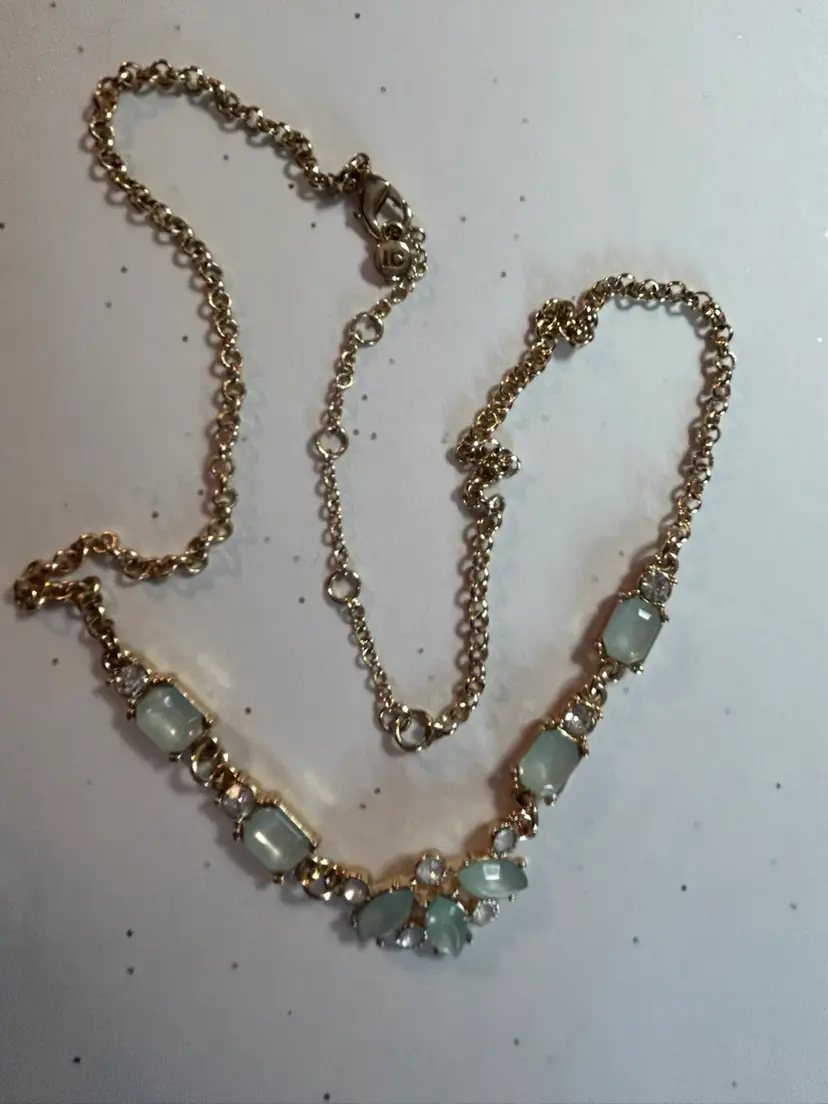 Vintage gold chained Liz Claiborne necklace with icy blue gems and faux diamonds. Would make a wonderful addition to a prom dress, any other formal dress, or even a pastel colored sweater.