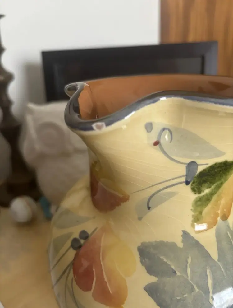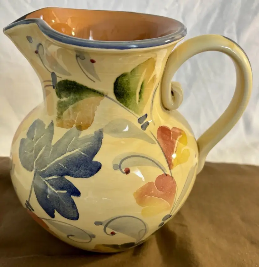 Beaitiful Ceramiche Alfa hand-painted pitcher. 2qt size. It has a very tiny lip chip. Please see photos. Price reflects this flaw, makes it a very good buy!