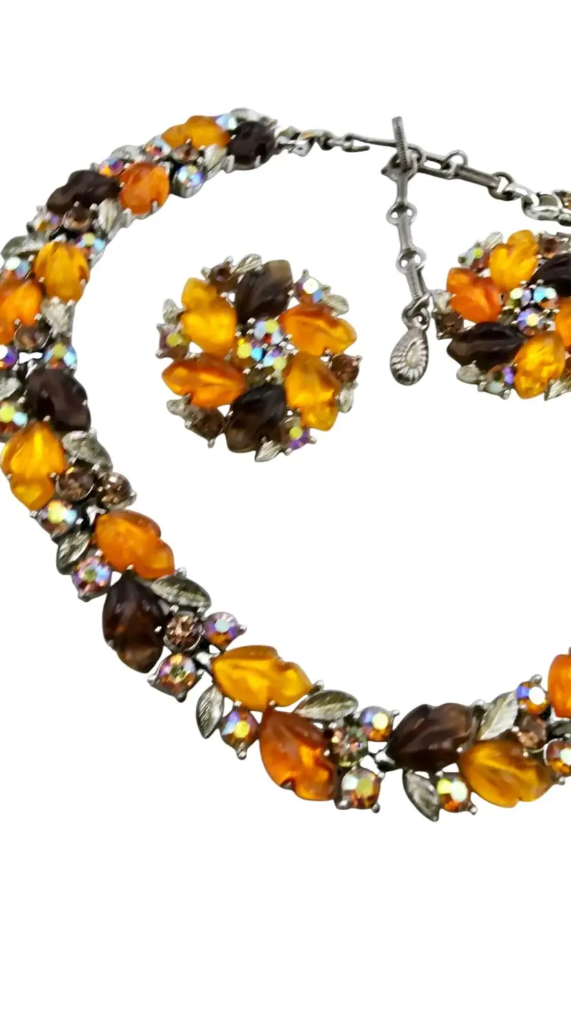 Size: Necklace is 17", Clip earrings 1.25" Condition: Good vintage; Some darkening to the back Signed: Lisner marked on earrings. Details: J-hook closure with lisner hangtag. Spectacular set!