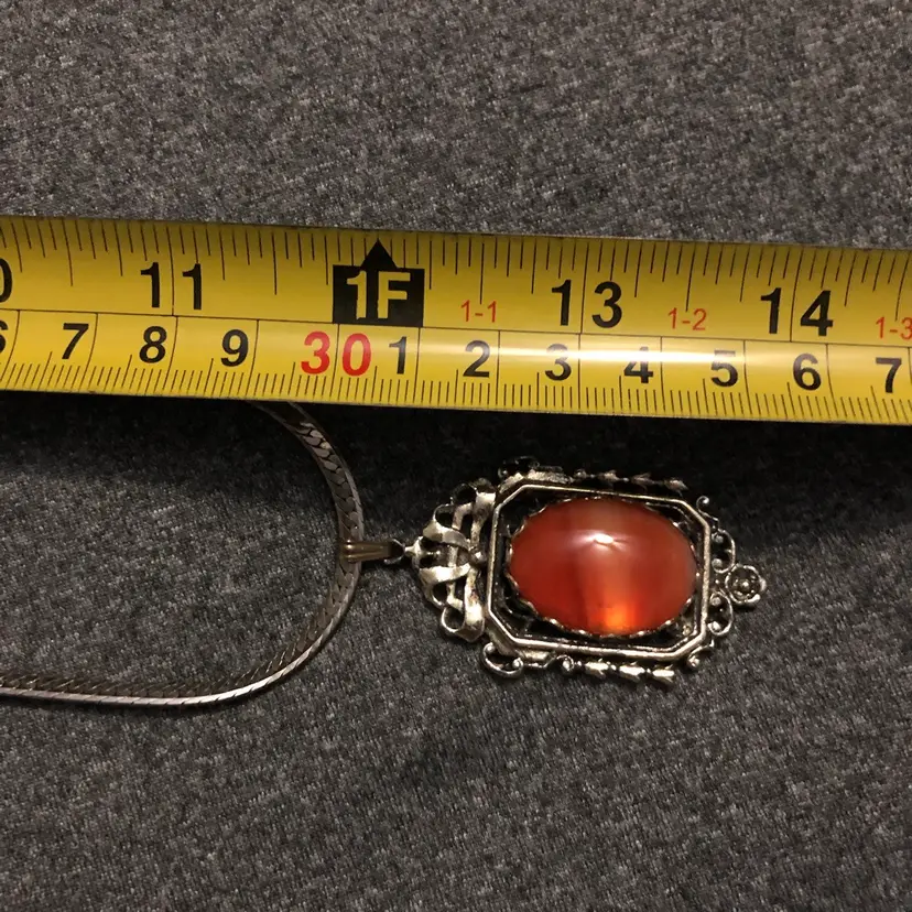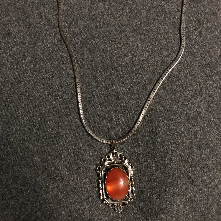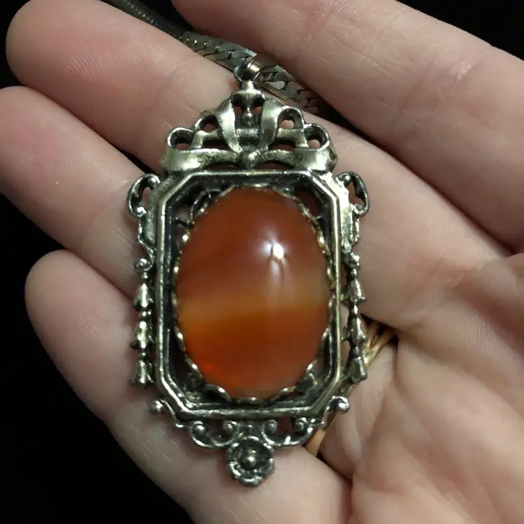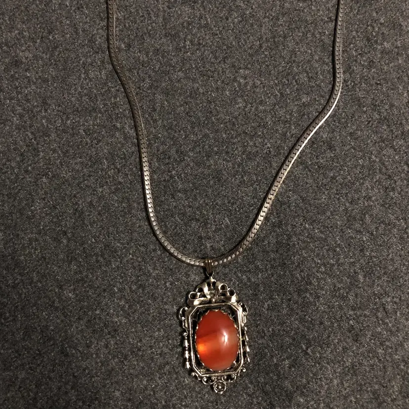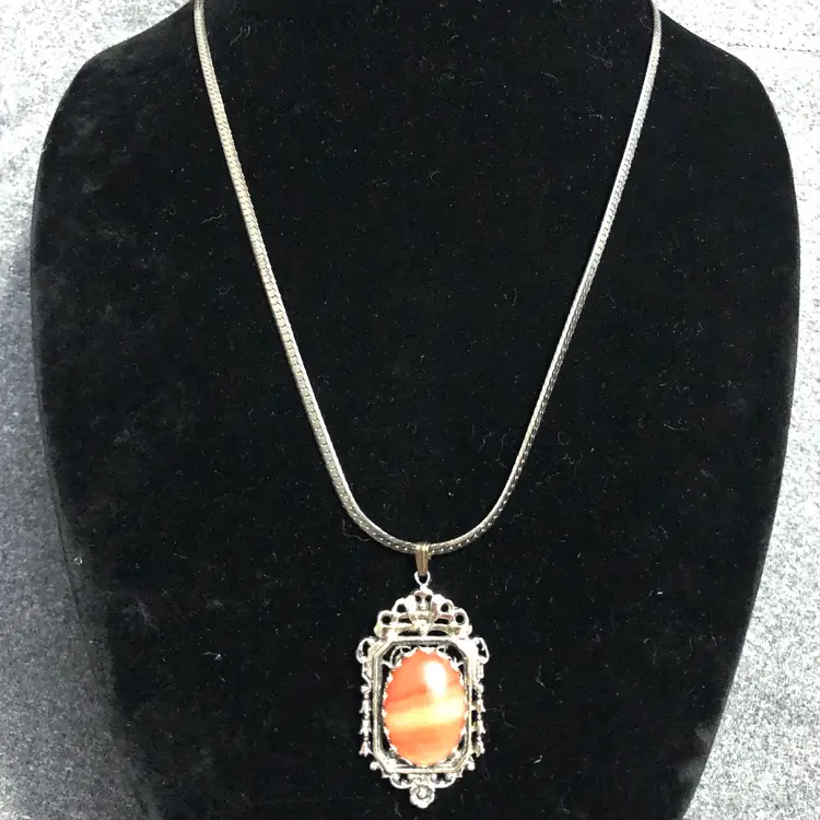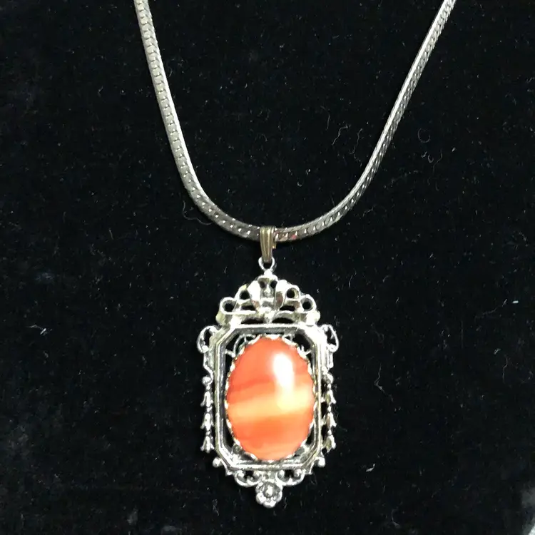 Beautiful Ornate Pendant Rust Orange Cabochon Silver-Tone Necklace