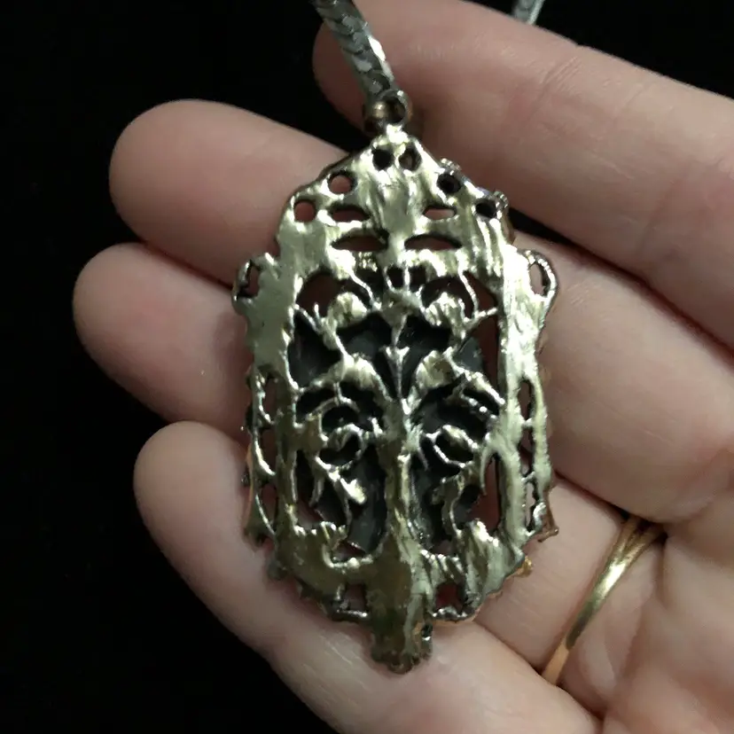 Absolutely beautiful necklace Unsure of what the stone is About 24 inches in length when unclasped The pendant is really stunning (even prettier in person)