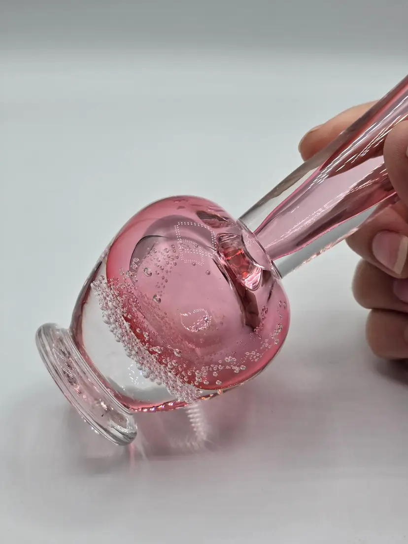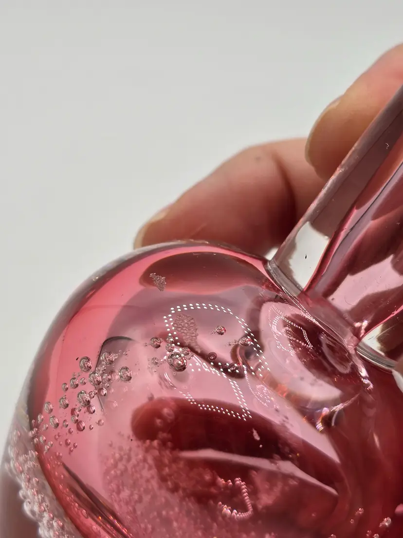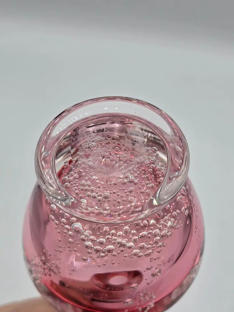 Beautiful bud vase of pink colored hand blown glass made by artist Buzz Blodgett, who signed the bottom with his name and '96. Has stunning controlled bubbles on the bud of the vase. There is a minor scuff mark on the bottom but difficult to see. Other than the scuff, its in perfect condition. Please reference photos for condition/scuff and reach out with any questions. Thank you for your time and interest.