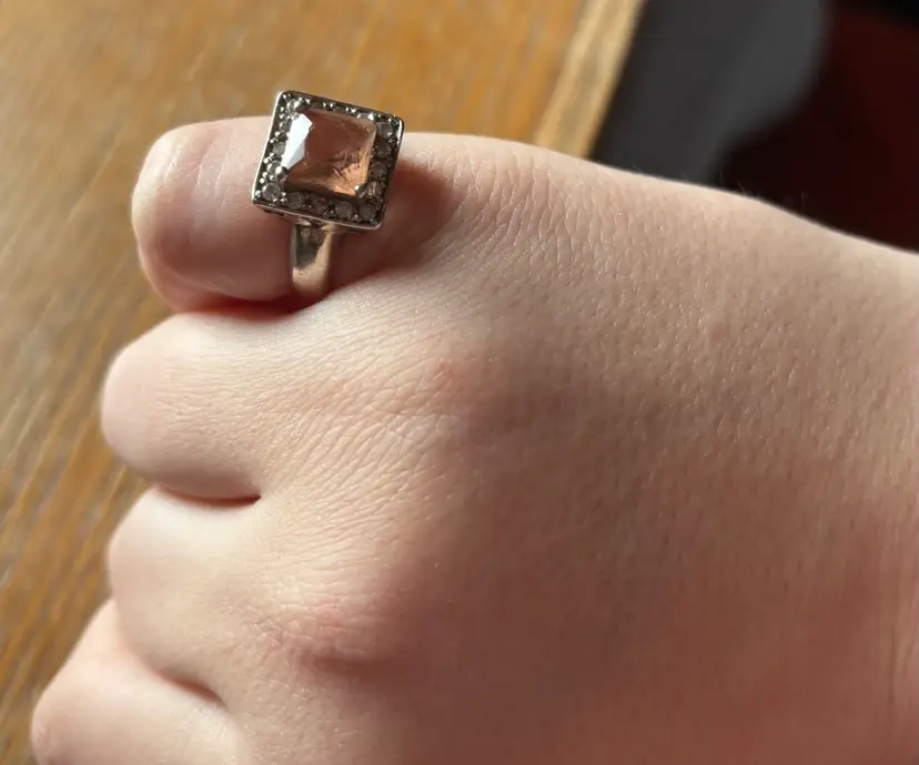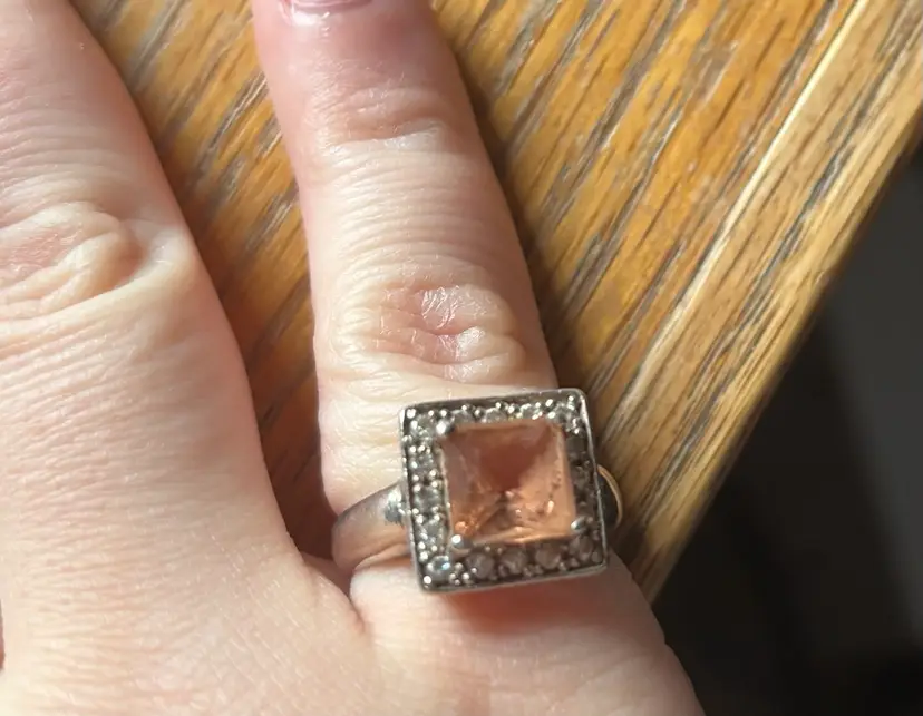 Stunning ring featuring a square-cut light brown/pink stone surrounded by smaller, clear stones. Silver band with some wear. Elegant and eye-catching.