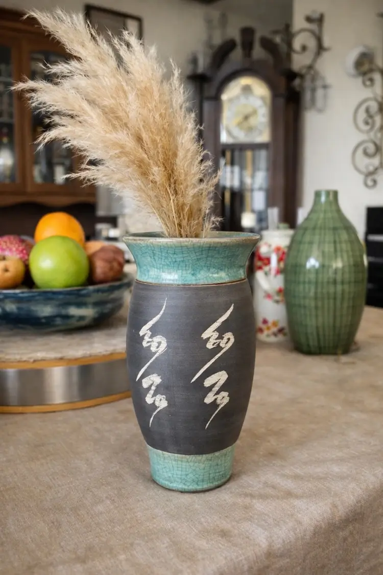 Hand-thrown and signed D. Moody, 1996, this studio pottery vase carries a rich charcoal body wrapped in hand-carved markings, finished with a soft turquoise crackle glaze along the rim and base. The contrast is striking—earth and sky meeting in one quiet, grounded form.