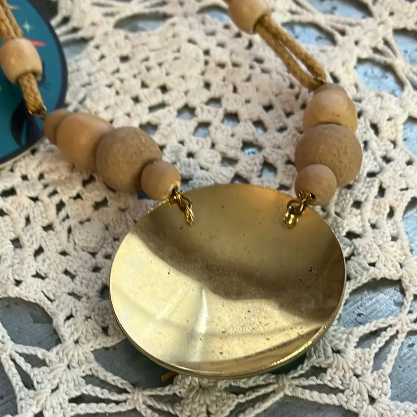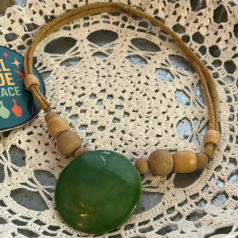Beautiful Statement, Peace, Green Metal Disc With Wooden Beads On Rope Hanks, 12 Inches From Clasp