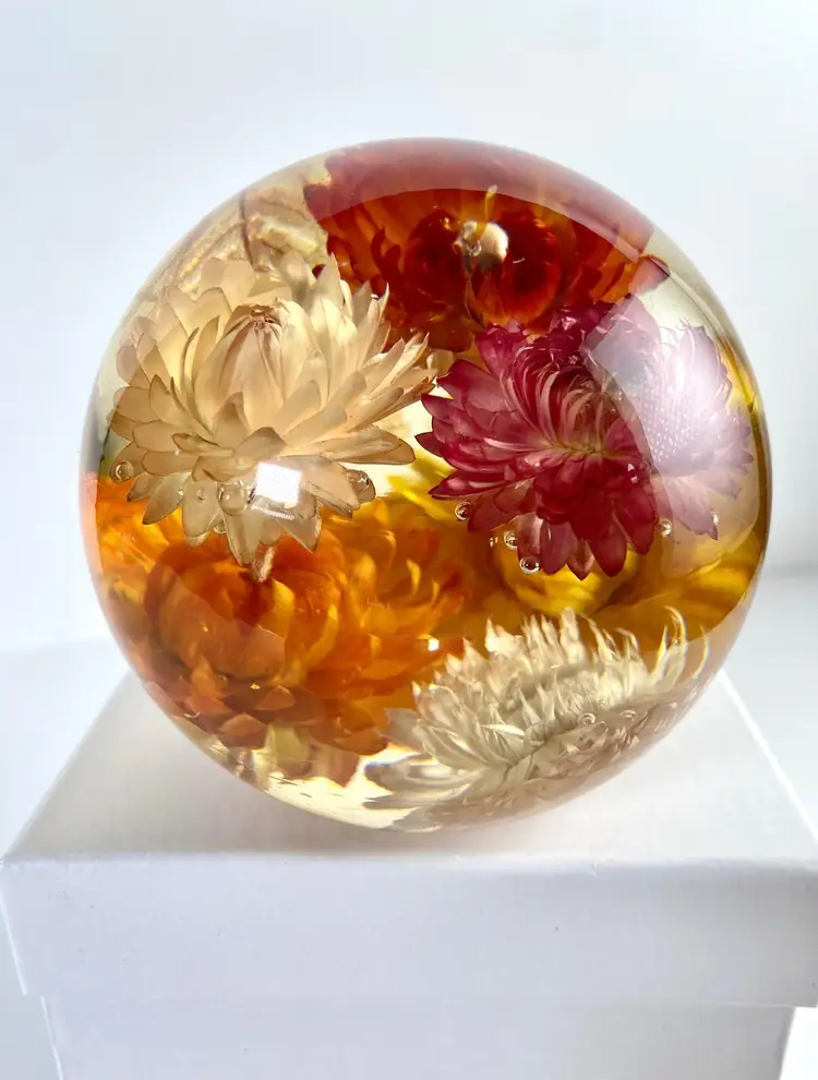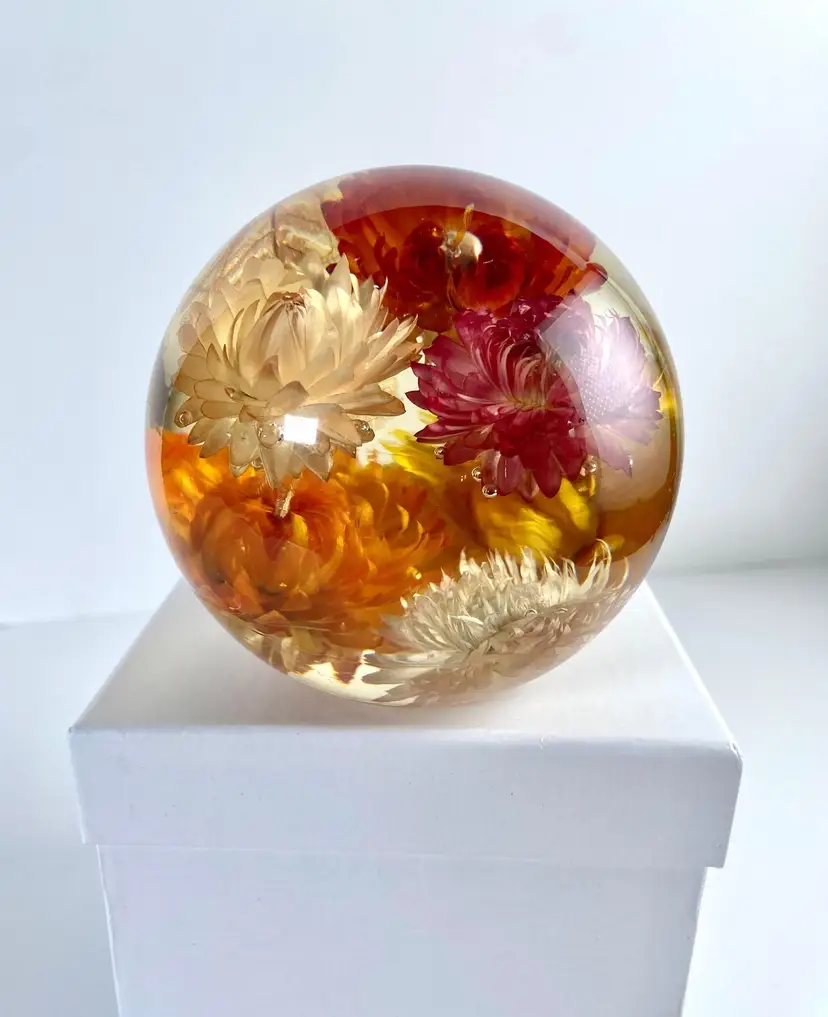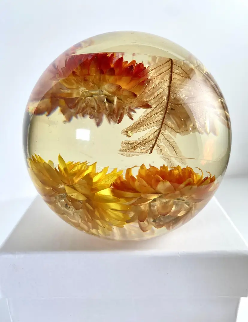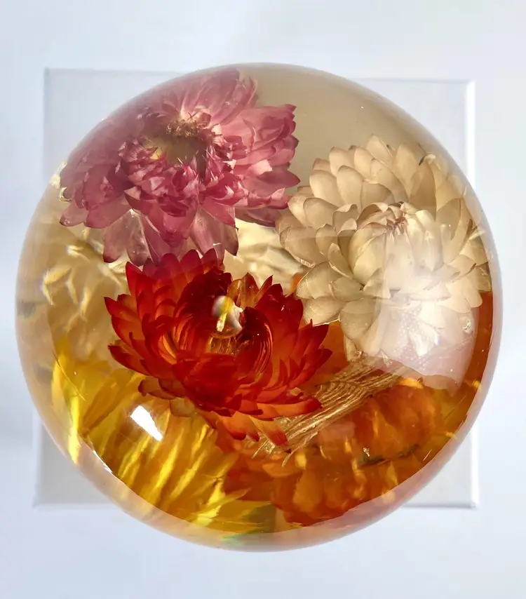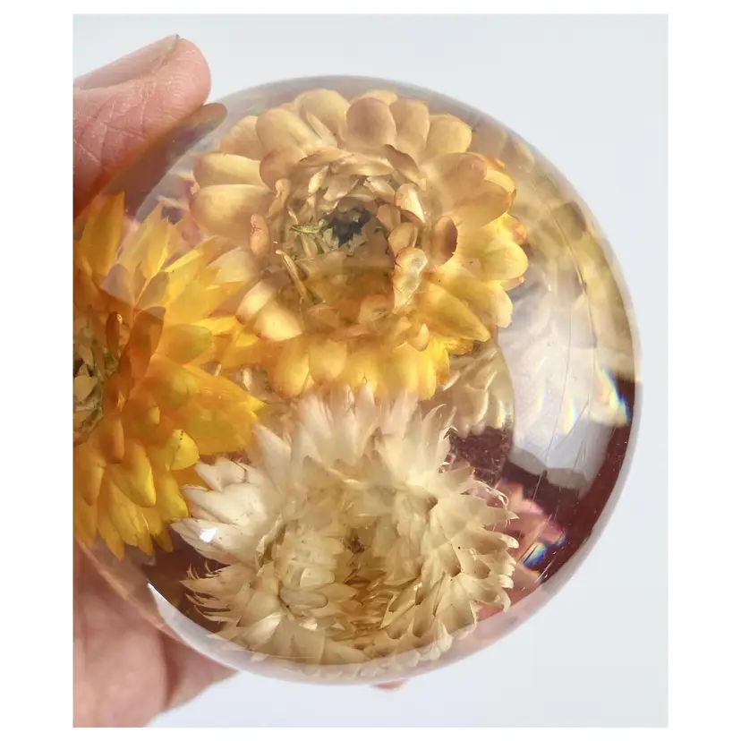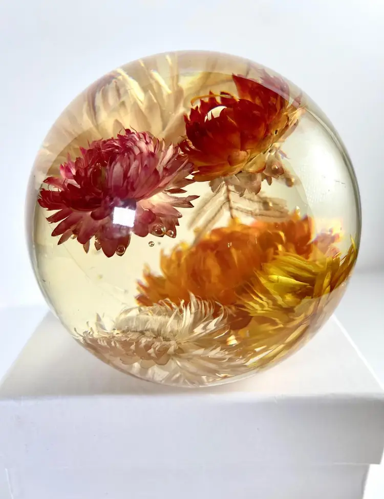 This piece will add a unique decorative element to your space. The bottom is flat, allowing you to place on a table or other flat surface without rolling off. This piece is made in multiple layers, slowly adding the flowers to the resin gradually. It is in very good pre-owned condition with no flaws.