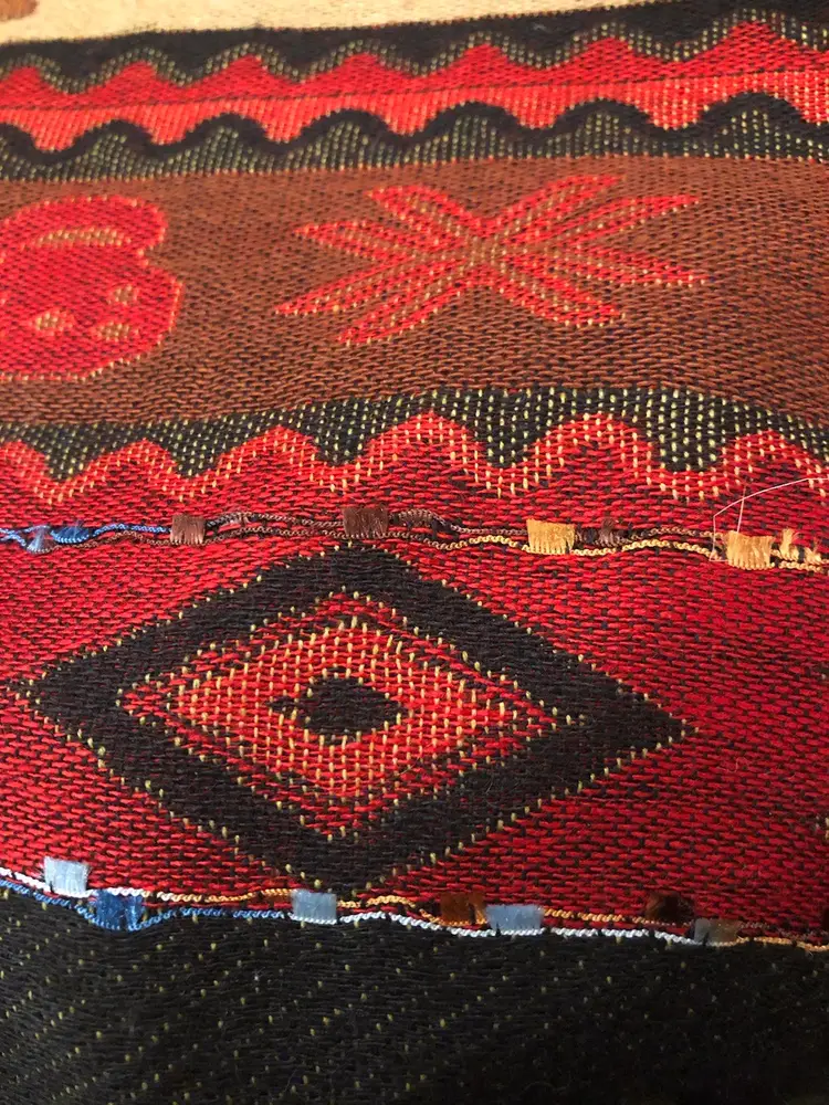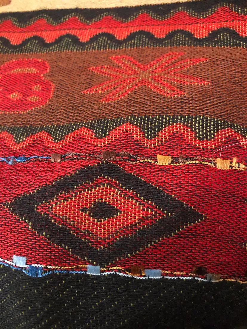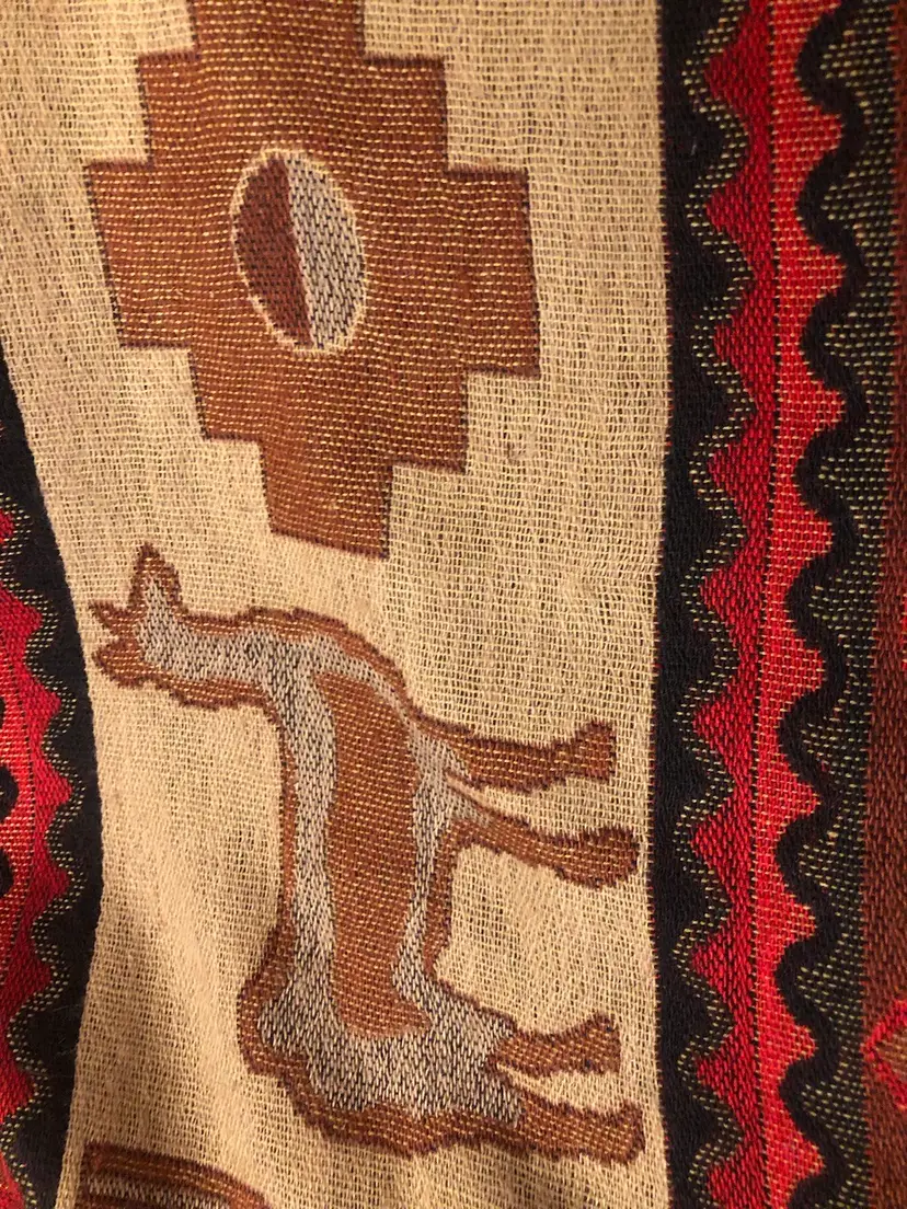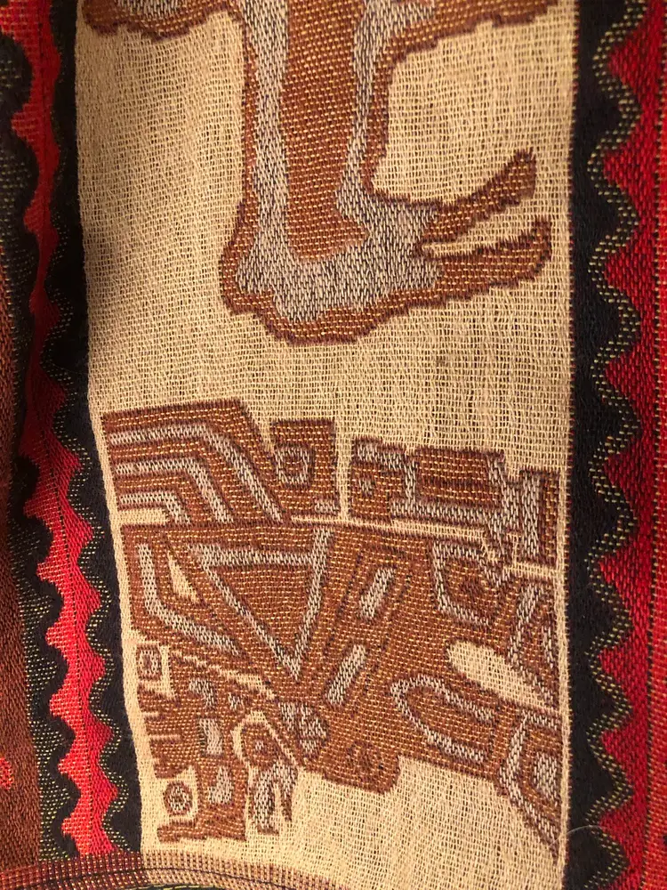 Red,Black,Gold designs with fringe. Light weight and soft finish. 68X24 inches.