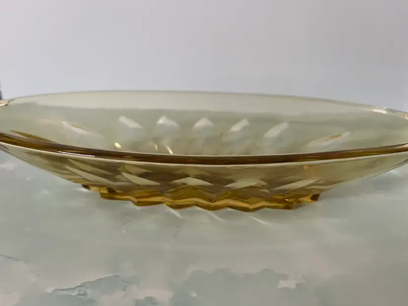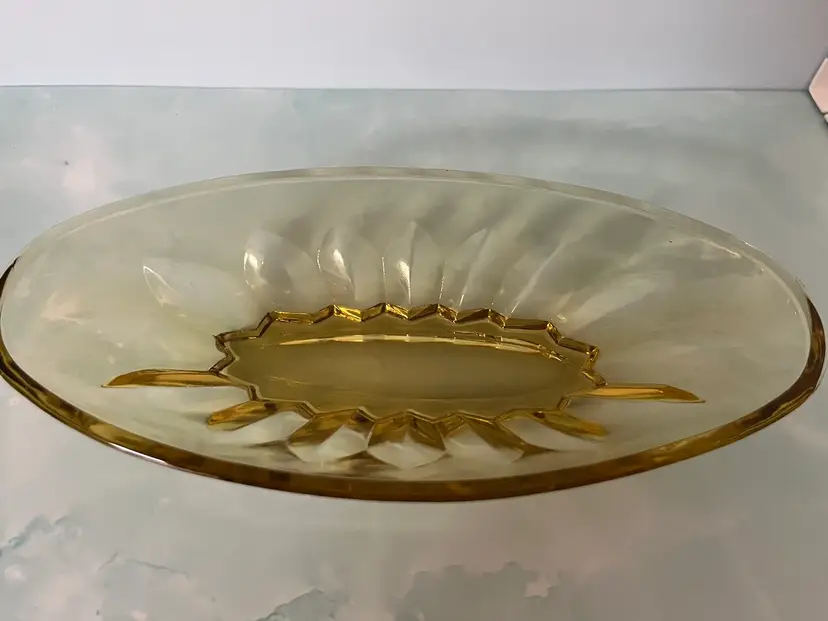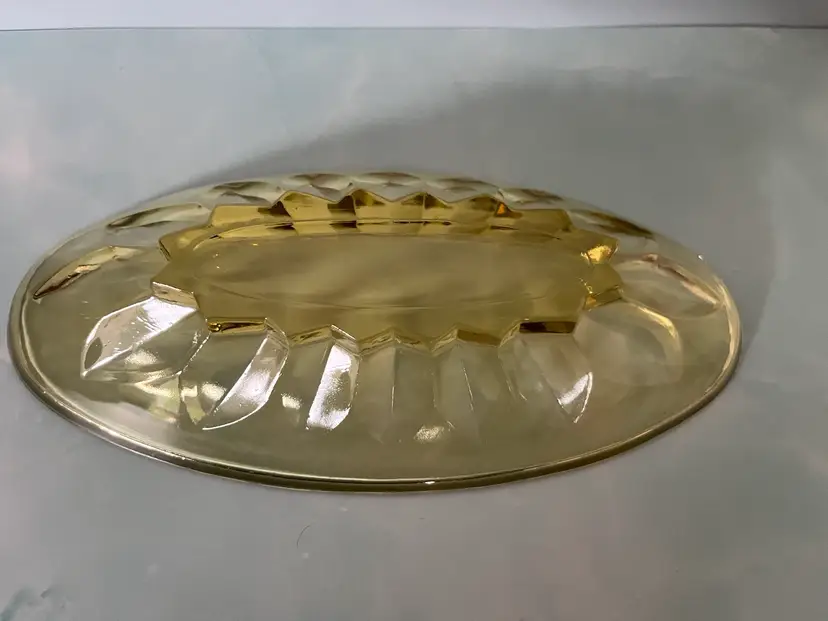 This vintage Hazel-Atlas relish dish set is a beautiful addition to any mid-century modern collection. They will look amazing on your holiday table or as part of your decor. The oval shape and glossy amber finish make them a perfect decorative pair for any dining table. The dish is made of pressed glass and has one compartment, measuring 9 inches in length, 4.5 inches in width, and 2 inches in depth. The item weighs 12.5 ounces and features a diamond pattern base. It is an original vintage piece from the mid-20th century, manufactured in the United States. The dish is easy to clean and sturdy. It is a perfect choice for anyone who loves retro style and wants to add a touch of vintage charm to their kitchen.