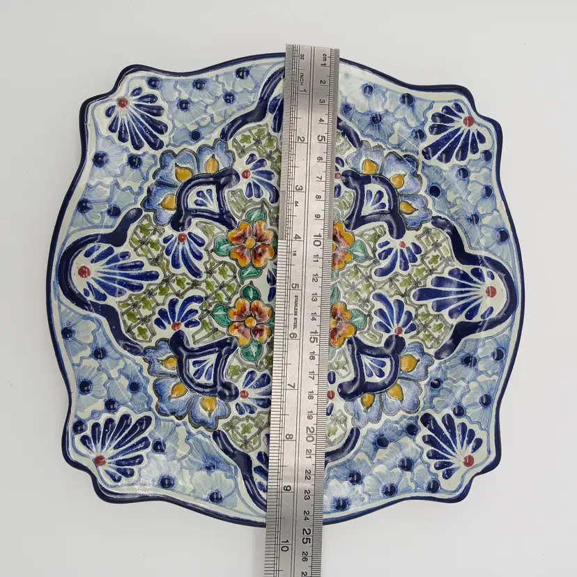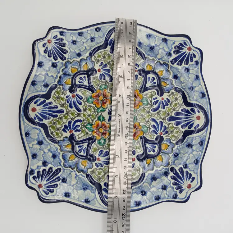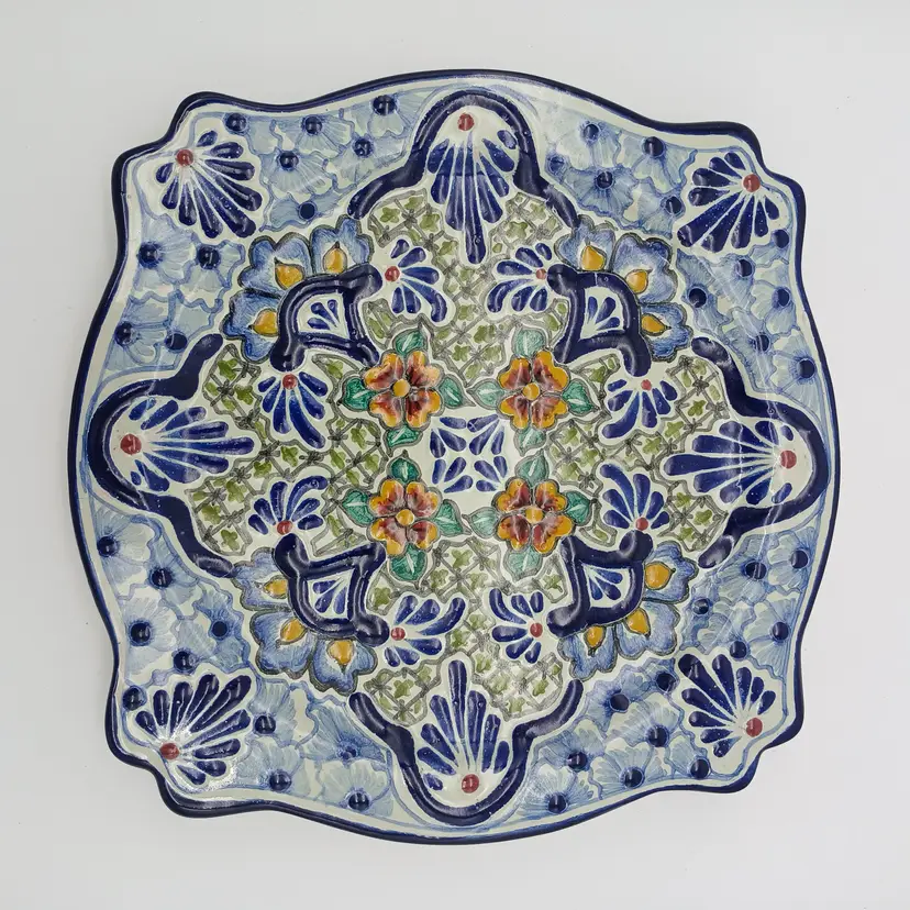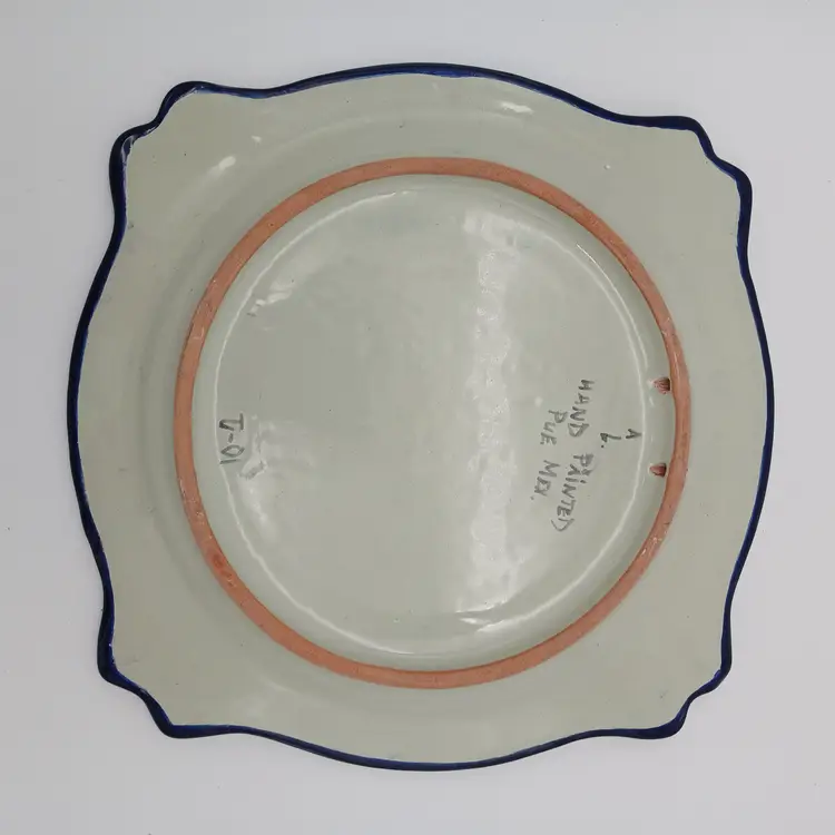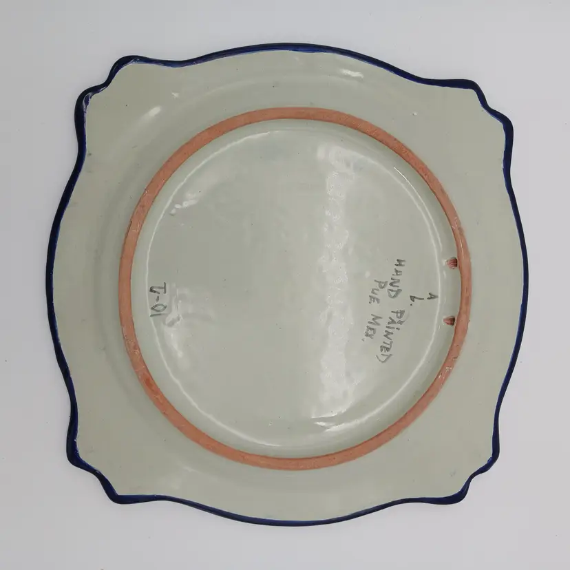 Gorgeous Talavera wall plate. Handpainted and signed by the artist. Not quite square, not quite round, this plate is about 9.75" across. The colors are so beautiful and vibrant. This is one of six plates acquired at an estate sale. It is fabulous!