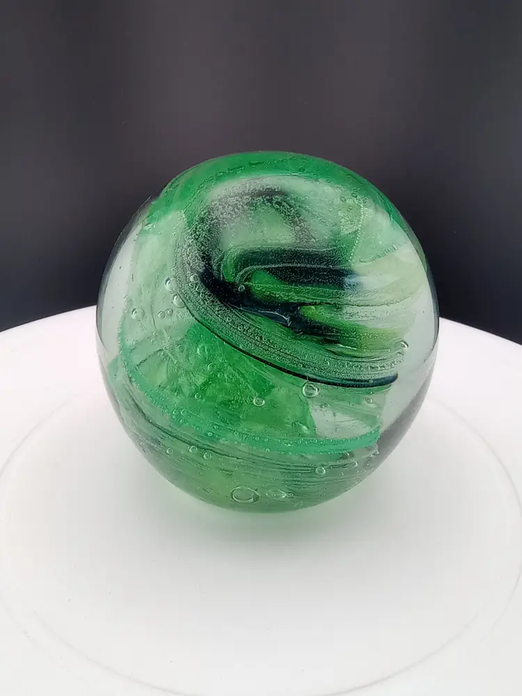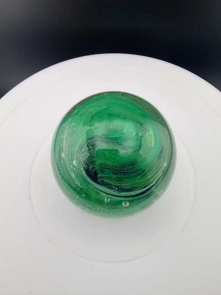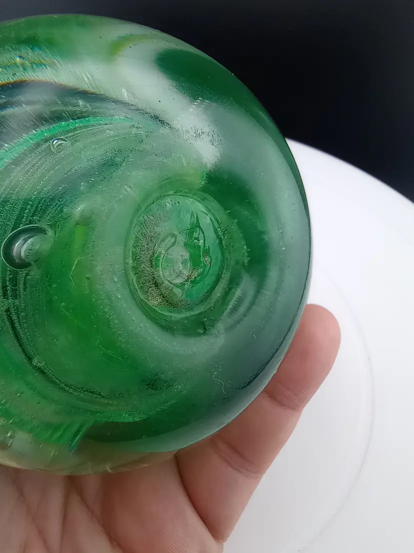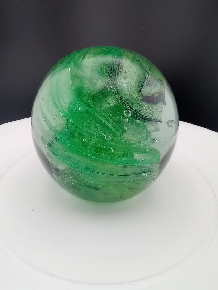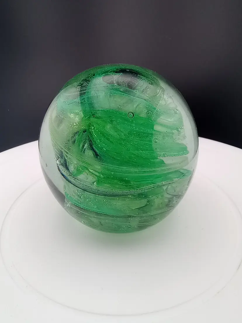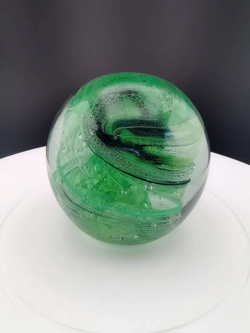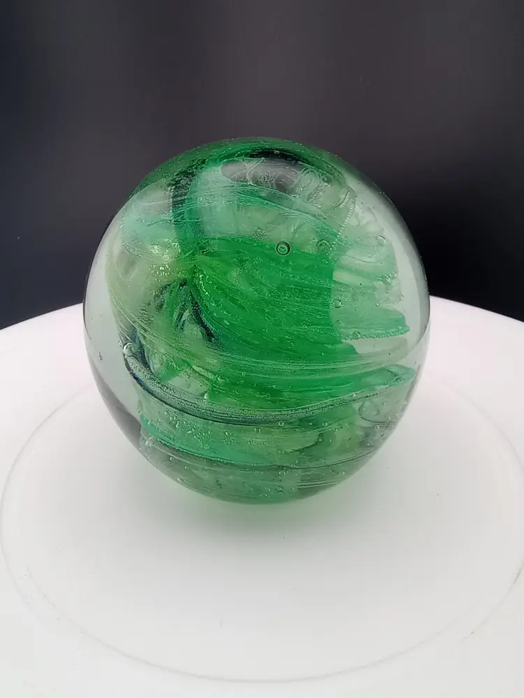 This beautiful paperweight from Ireland is swirled with shades of green, almost creating a galaxy inside the glass. It's mesmerizing and in excellent condition with no chips or cracks and a very clear flame stamp on the pontil. Approximately 3.5" tall and 3.5" wide