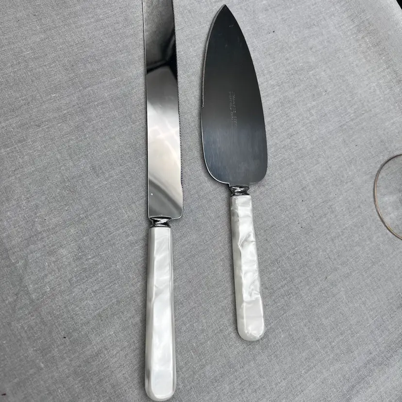 Beautiful Vintage Treasure Masters Sheffield England Mother of Pearl Handled Wedding Cake and Knife Serving Set In very good vintage condition
