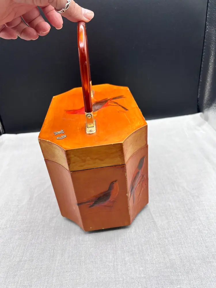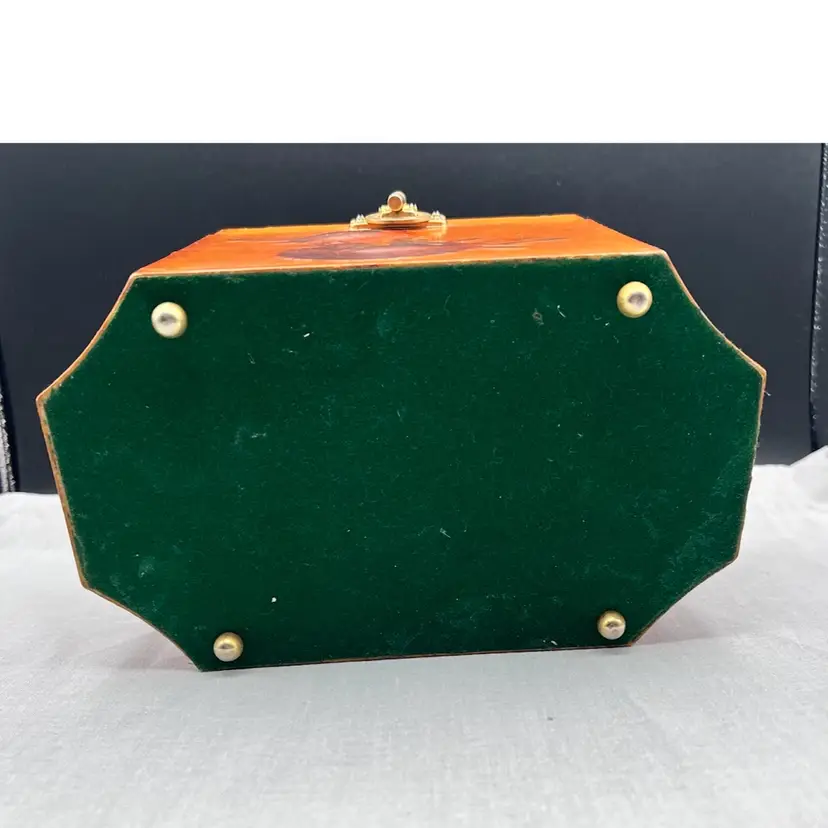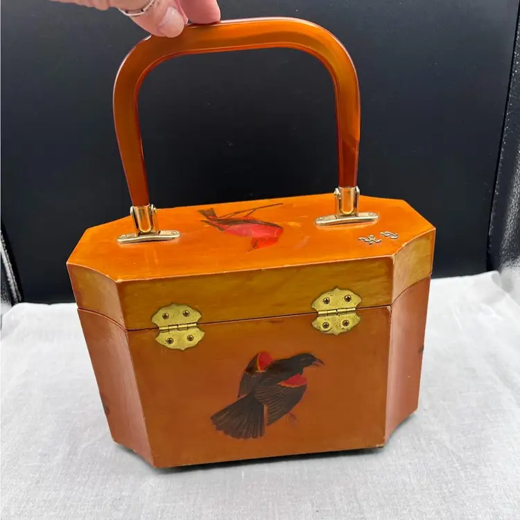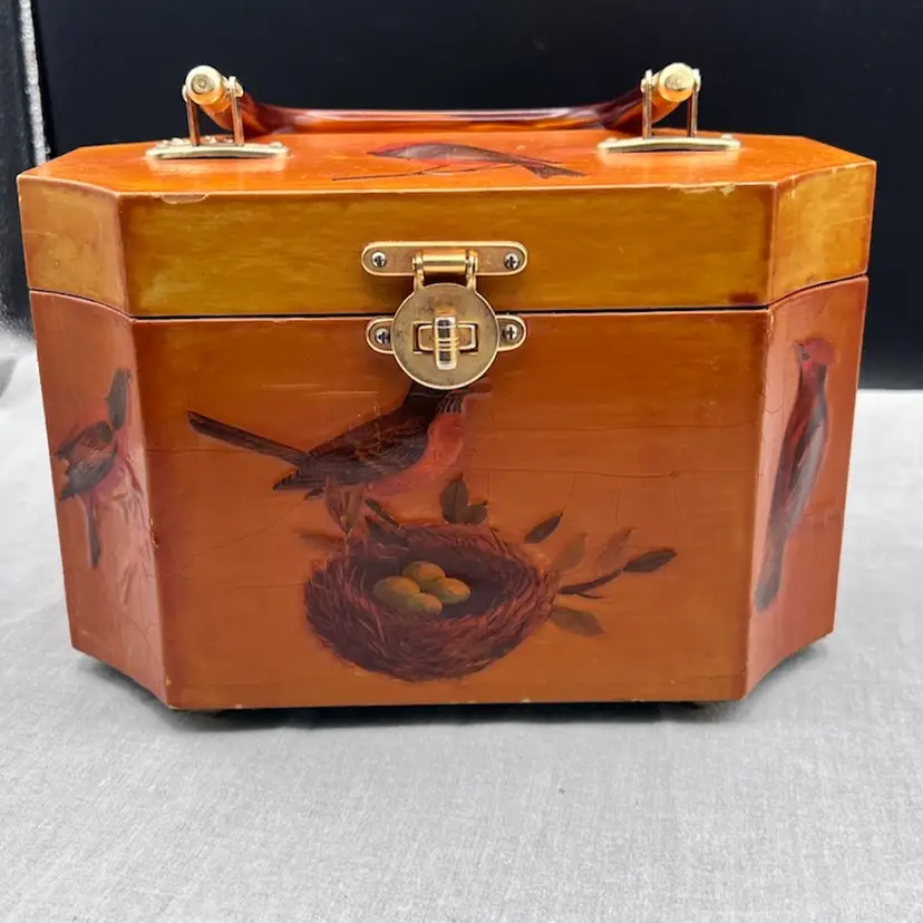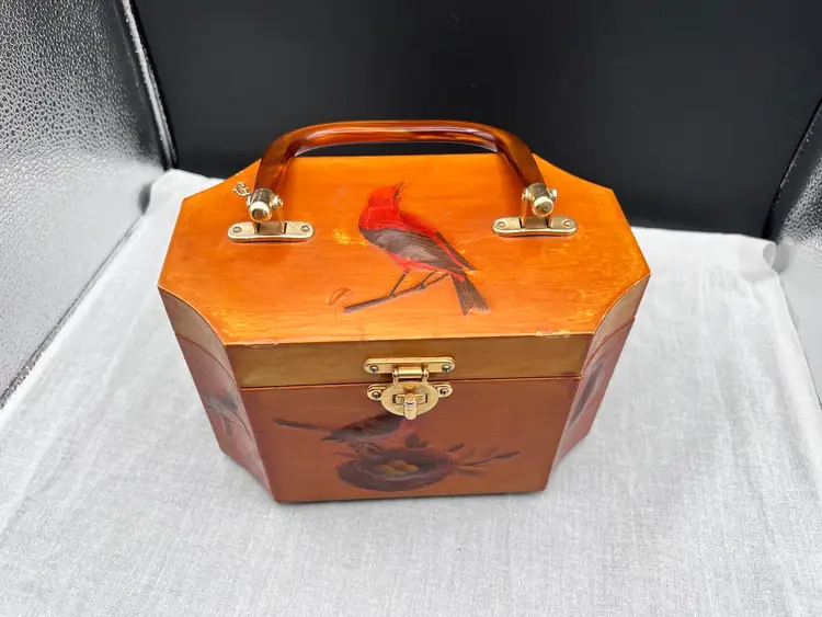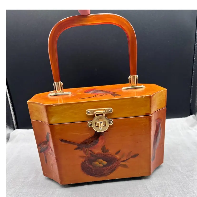 Beautiful Vintage Wooden Purse with Repose/Raised Birds on all Sides Gold Hardware and a brown handle (could be Bakelite) Green felt lining and on bottom. Bottom has brass nails for feet, interior also has red, green and black floral rick rack trim inside. Mirror is intact as well In very good condition, a couple places the wood has been scraped Unmarked 9" x 5" x 6" high